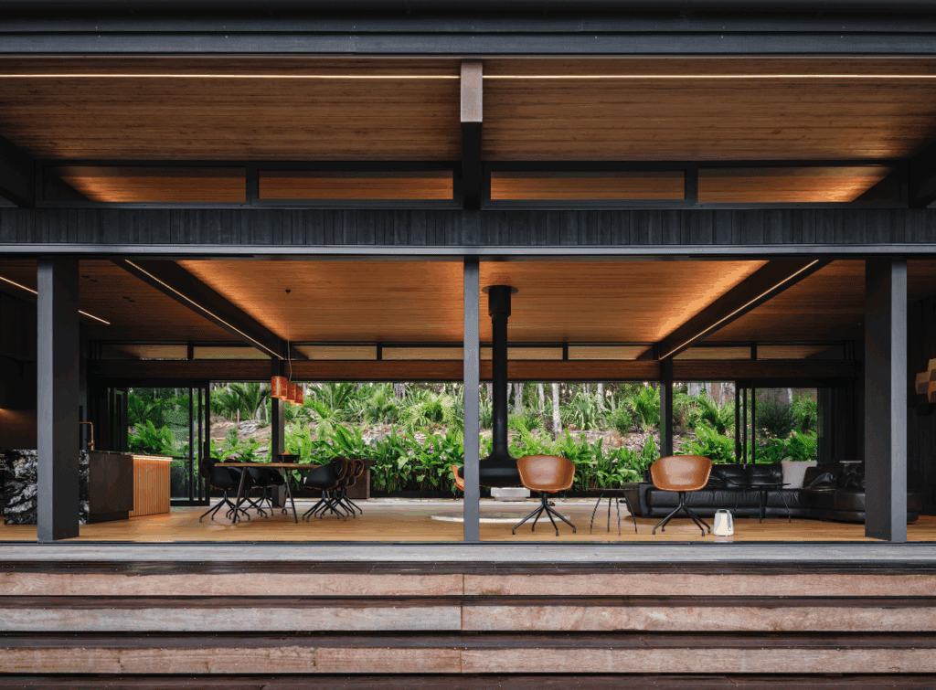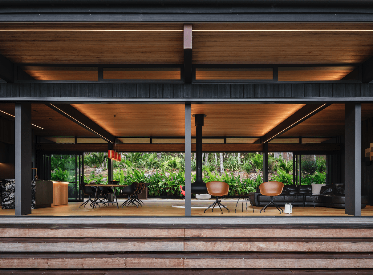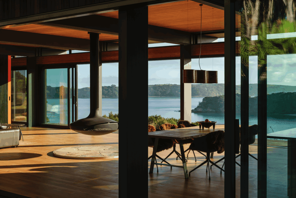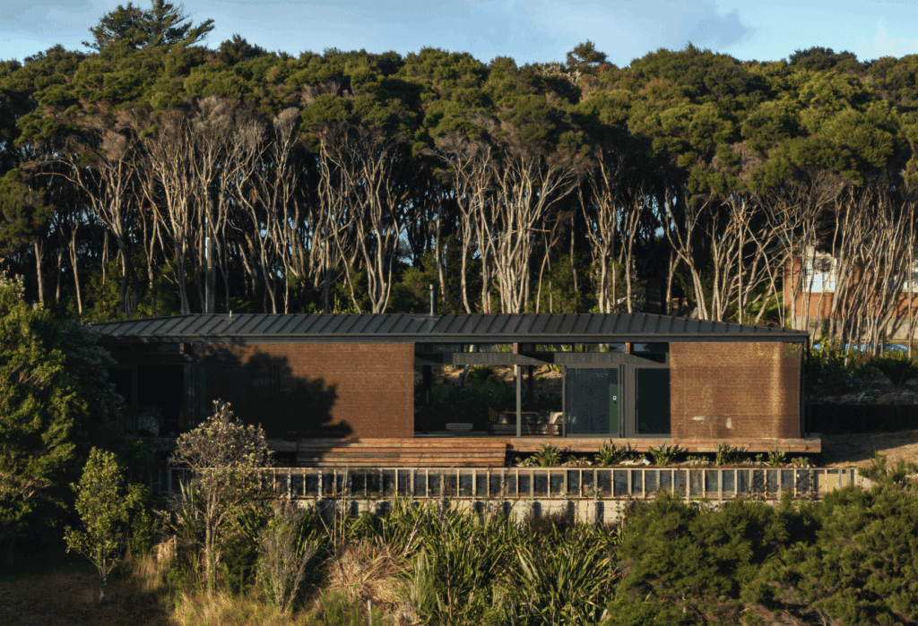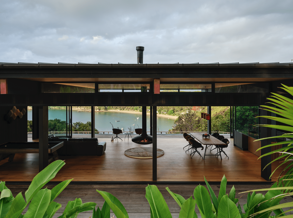 High above Little Vivian Bay on Kawau Island, a convivial pavilion sits long and low in a forest of kānuka — part kinetic sculpture, part holiday home.