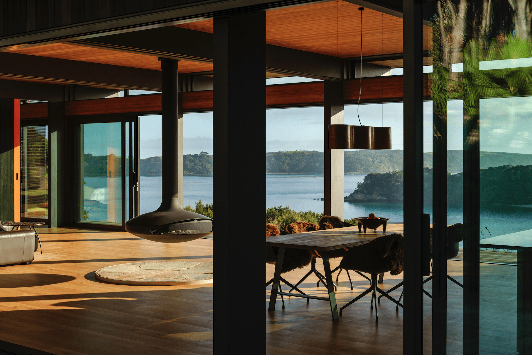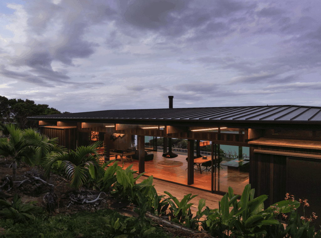 A tent-like roof stretches over generous eaves, creating shade and maximising rainwater harvesting. Beneath it, sliding walls of glass open the house entirely to the north-east, framing sweeping views along the bay, across the Tāwharanui Peninsula and beyond.