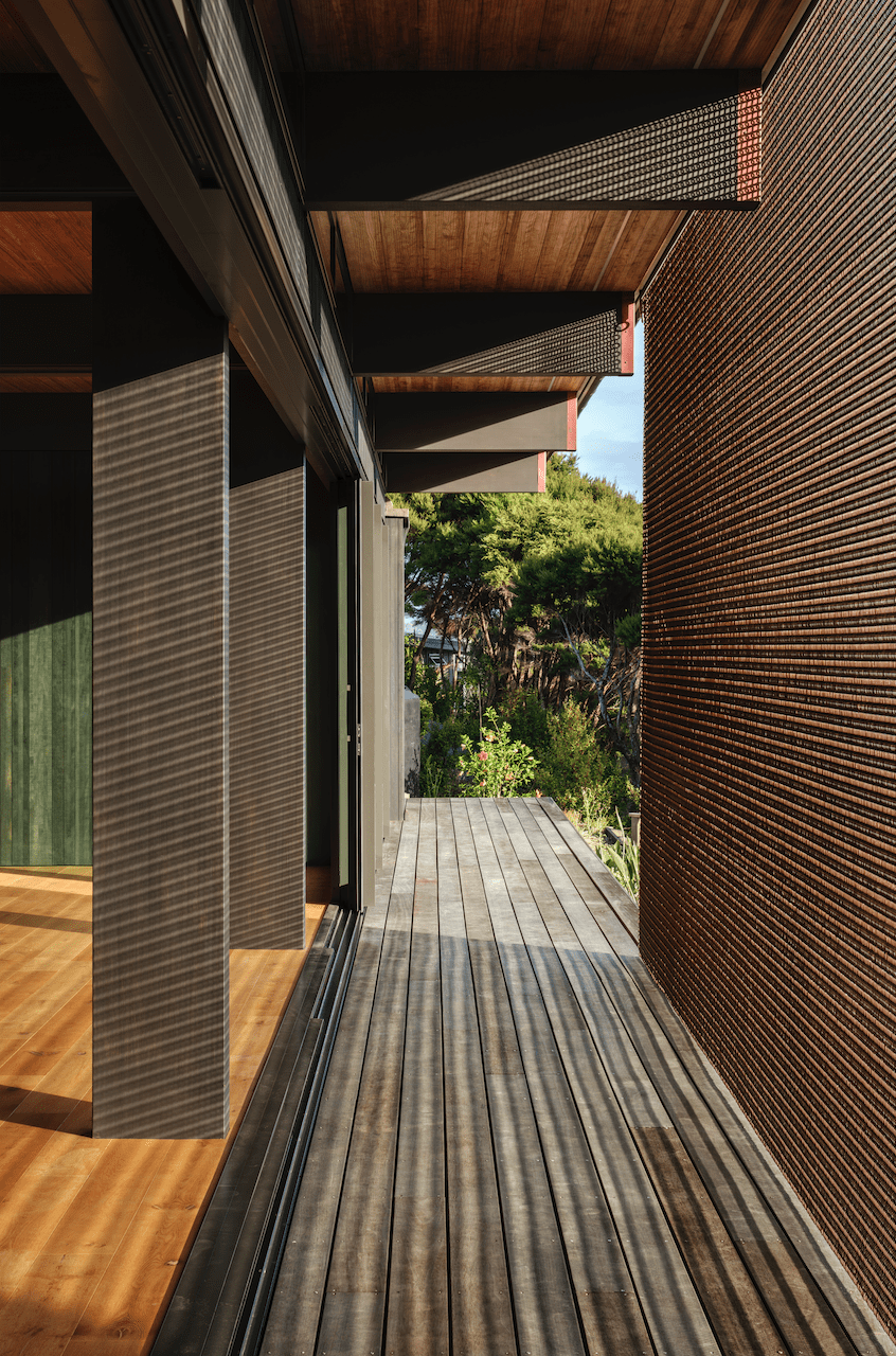 The pièce de résistance is an architectural mesh curtain that wraps around the exterior, designed in collaboration with Kayne Horsham from Kaynemaile. The bronze-toned mesh, custom coloured to blend with the surrounding kānuka, slides around the perimeter of the deck, tempering light, reducing glare, and providing privacy when required. In the breeze, the mesh curtains shimmer and sway, introducing a sculptural softness against the rigour of the modular frame.