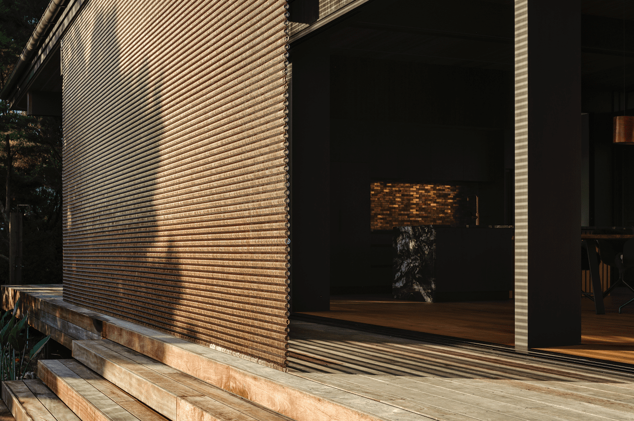 “We initially considered wrapping the house with screens or shutters, but we didn’t want a rigid screen. We ended up modifying a track system that is generally used for medical settings, and attached the Kaynemaile mesh to it. To allow for movement, it’s only attached at the top. When pulled across, it creates an enclosed verandah space. It was definitely a bit experimental, and quite a bold move, but it’s certainly one that everyone really enjoys,” Simon says.