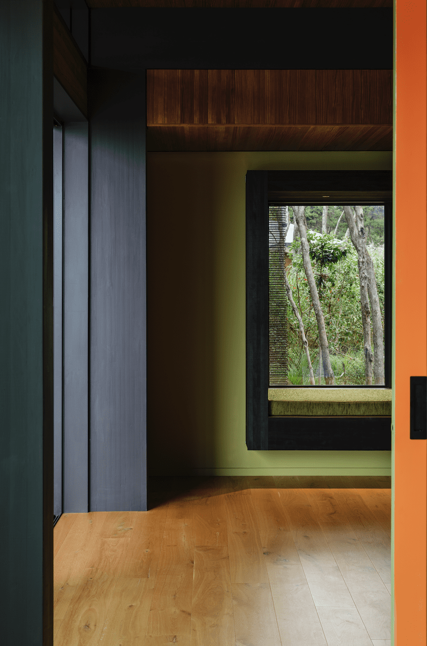 Outside, a textural rhythm is created using random-width boards that are stained a custom dark colour, reminiscent of the creosote bach. Inside, the Abodo is left natural — a durable, warm surface perfectly suited to coastal living.
