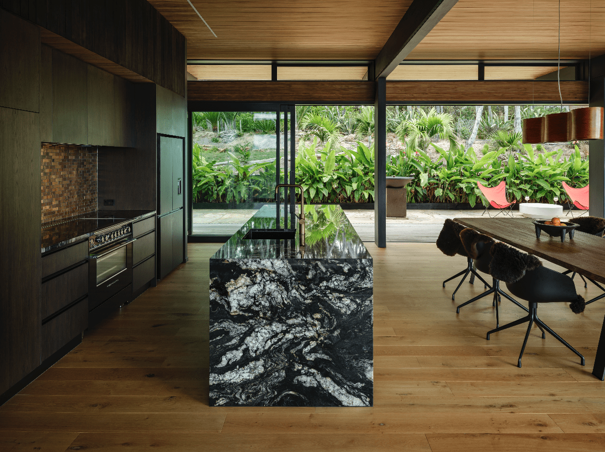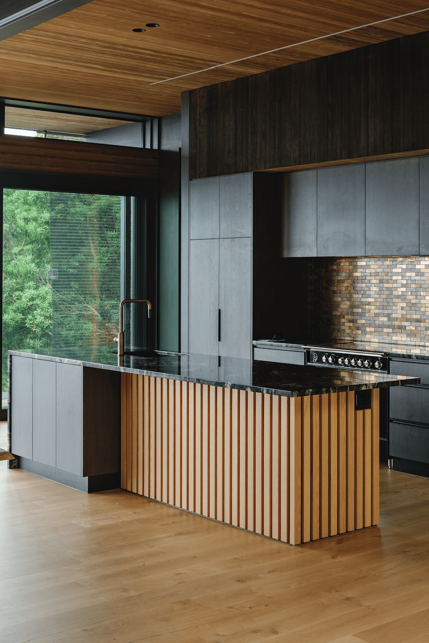 The kitchen, designed by Liz Kerby, is anchored by dark-stained, oak veneer cabinetry, a titanium gold granite stone island, and copper tiling behind — the latter two picking up on the warm tones of the timber and the bronze mesh.