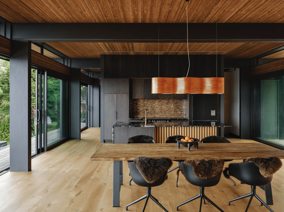 Separating the kitchen/dining and living spaces is a rotating, suspended wood fire — a fitting sculptural gesture in the heart of this special home.