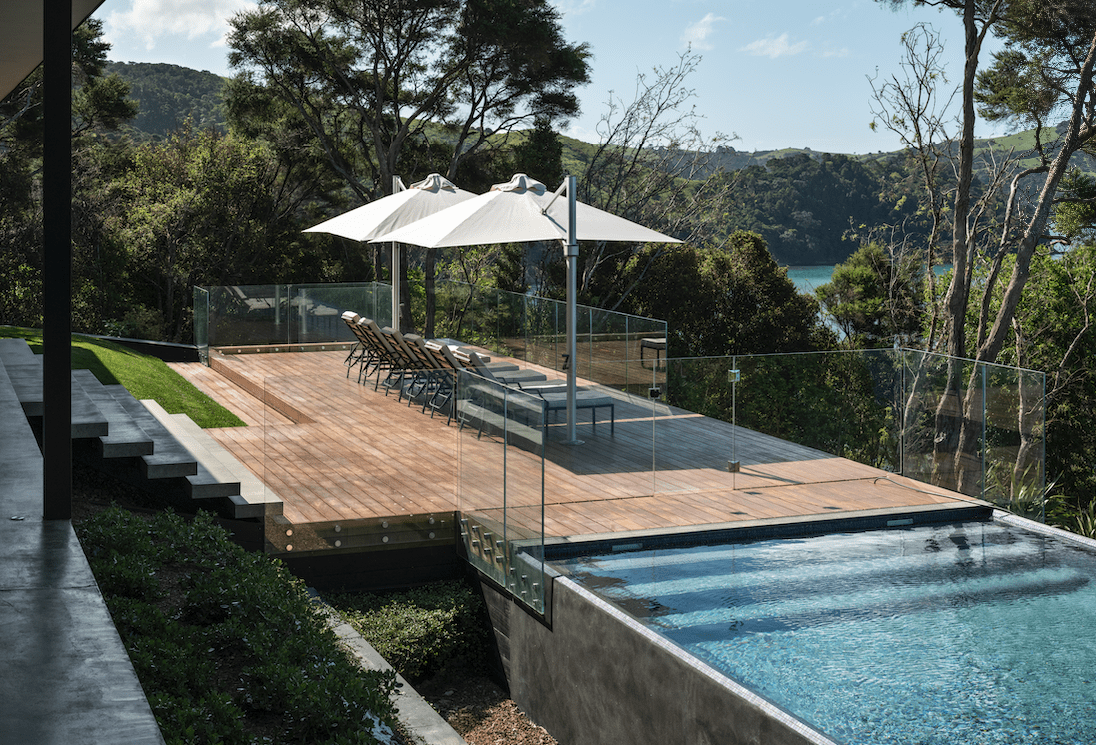 Below, a pool terrace is nestled into the sloping site, low enough not to interrupt the sweeping views of the coast, but high enough above the ground to avoid the need for pool fencing.