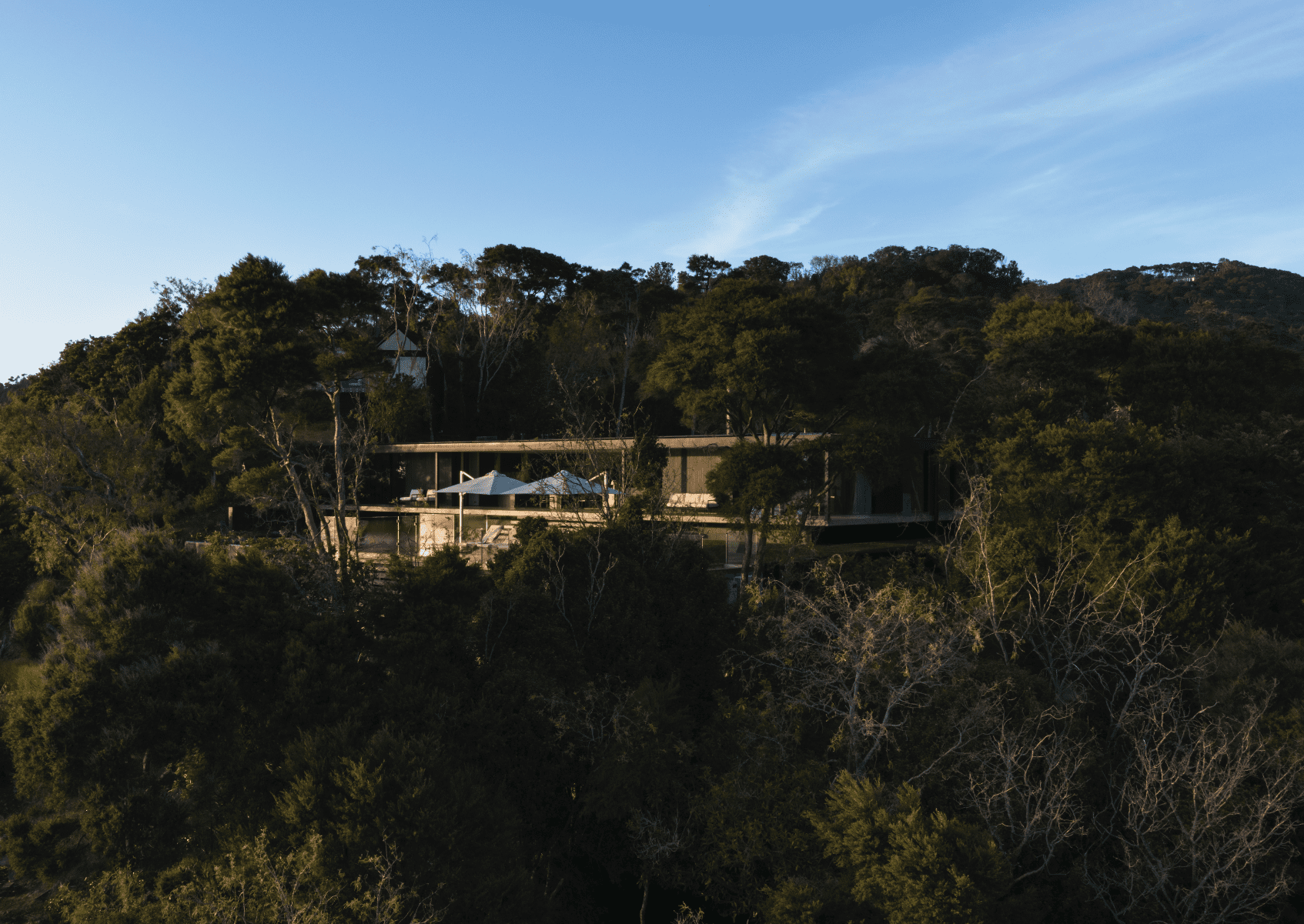 What connects each of the four buildings is their cladding: dark-stained Abodo — and, for the auxiliary buildings, matte black aluminium — that recesses into the bush, echoing the shadowy tones of the tree trunks.