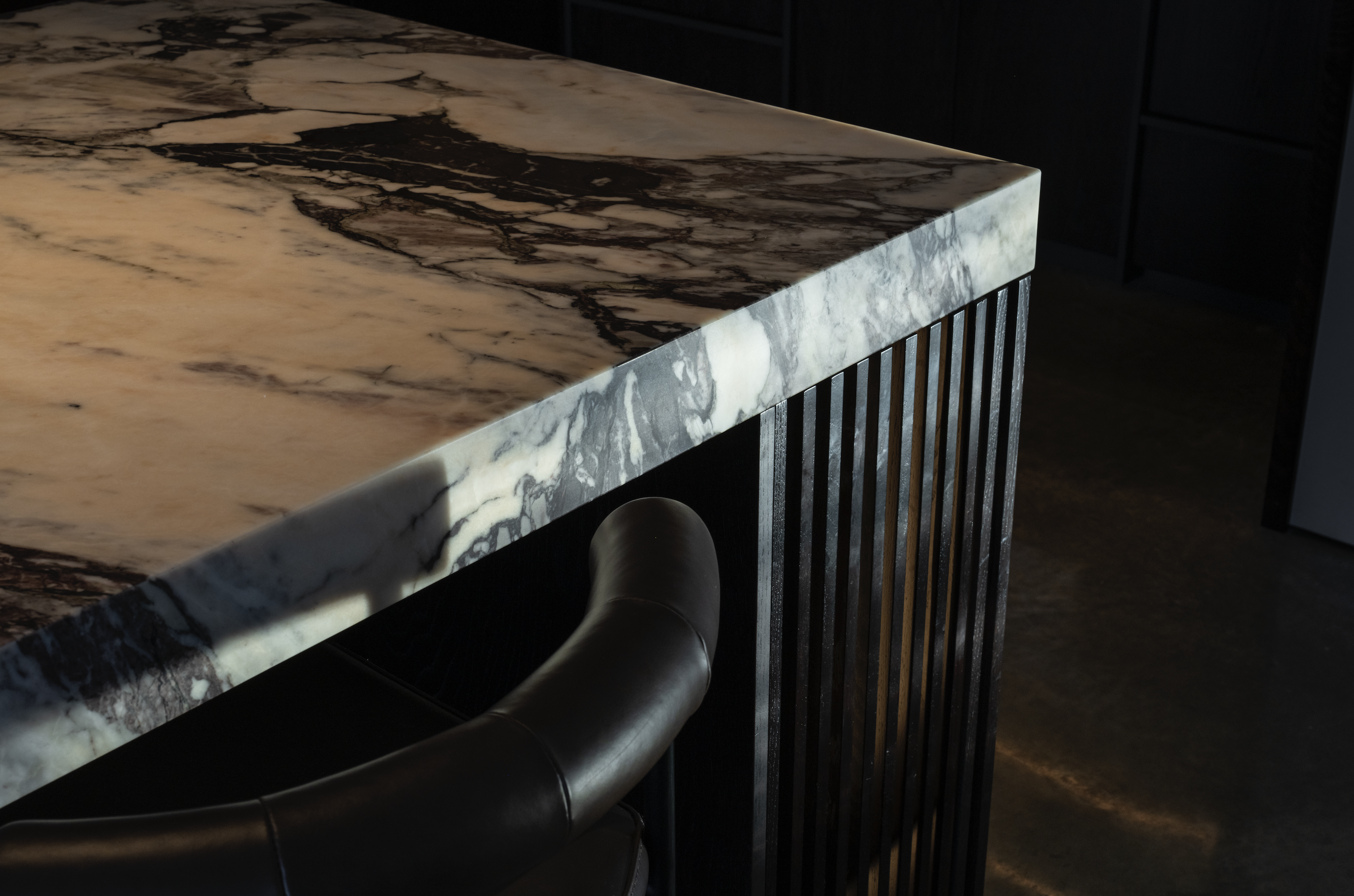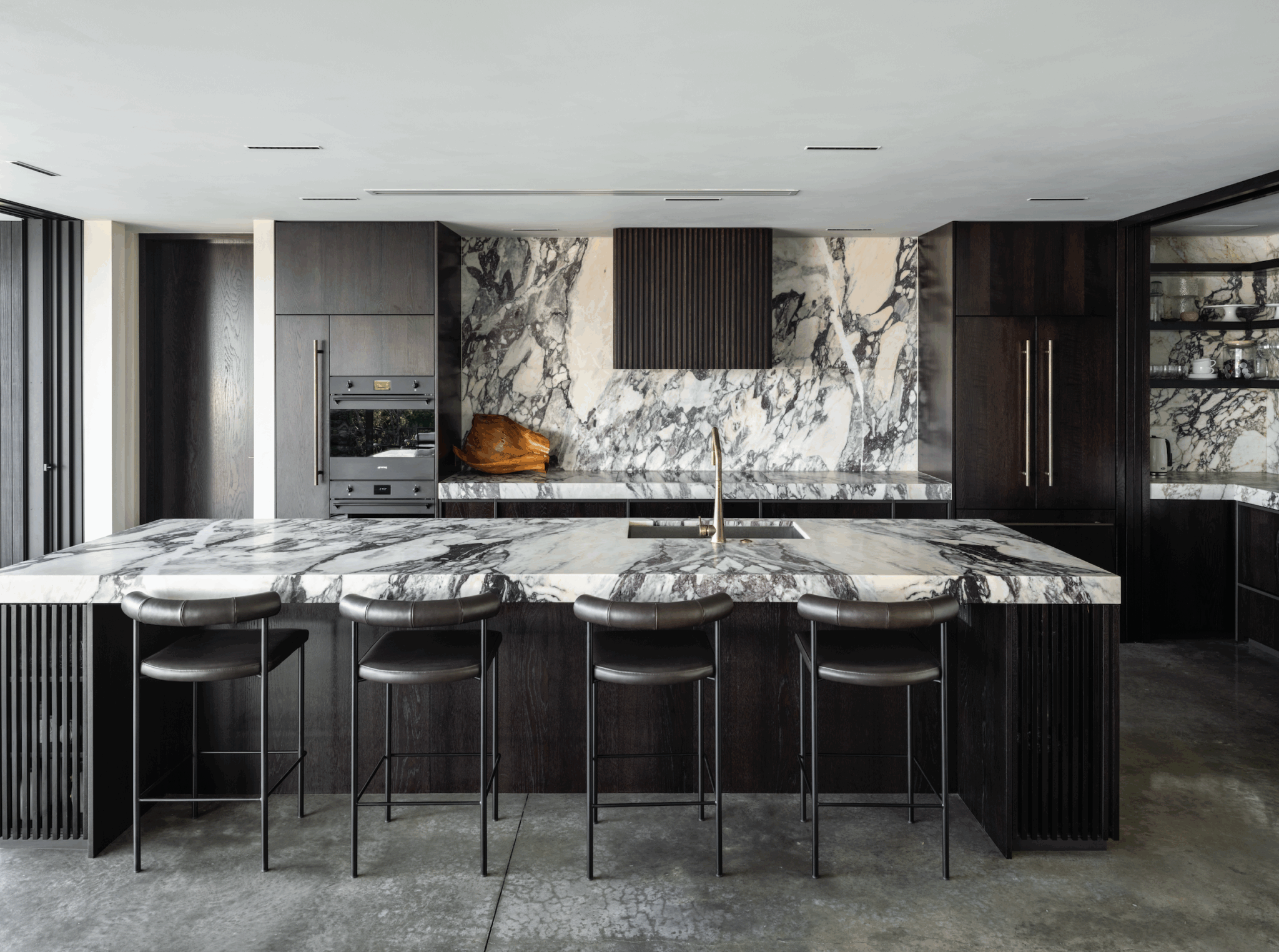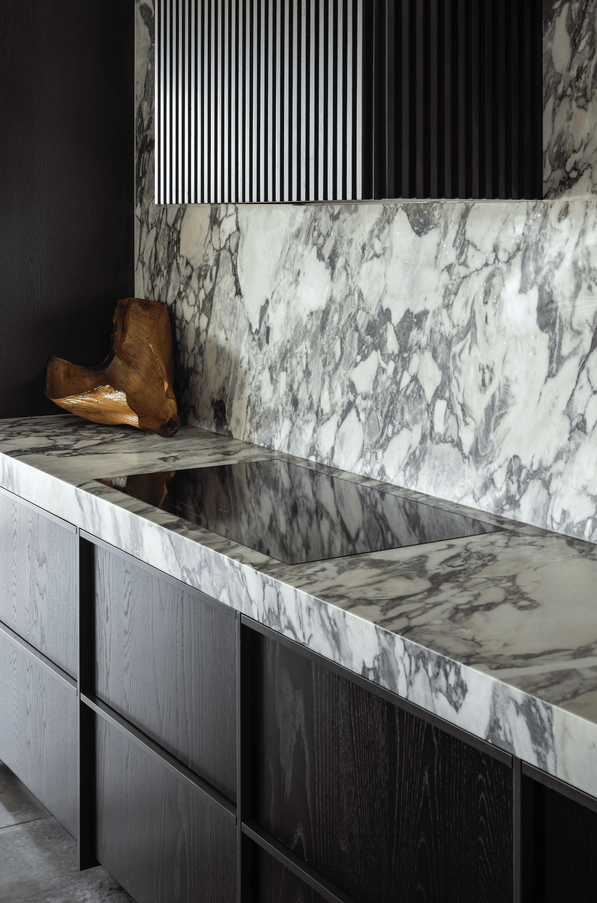 Oak-veneer cabinetry, custom stained to a soft, earthy tone, is used throughout, while Viola marble was chosen for kitchen and fireplace surfaces. “It’s a very glamorous holiday home, and this stone articulates that with its veining and warmth.”