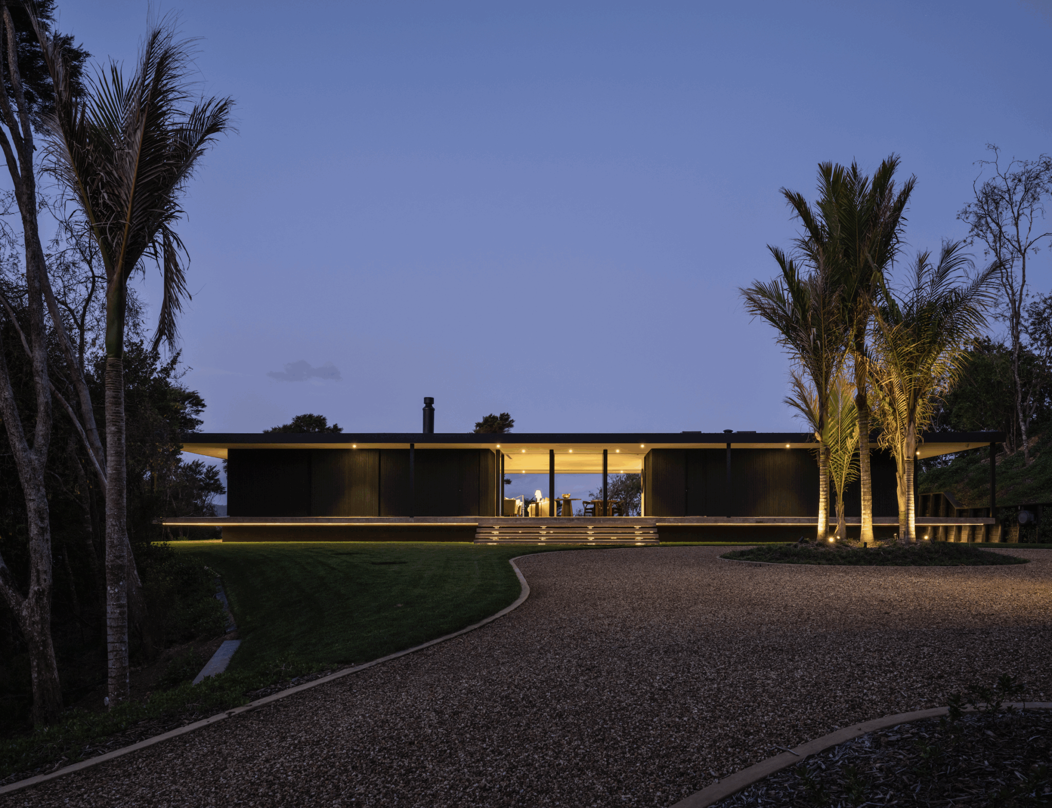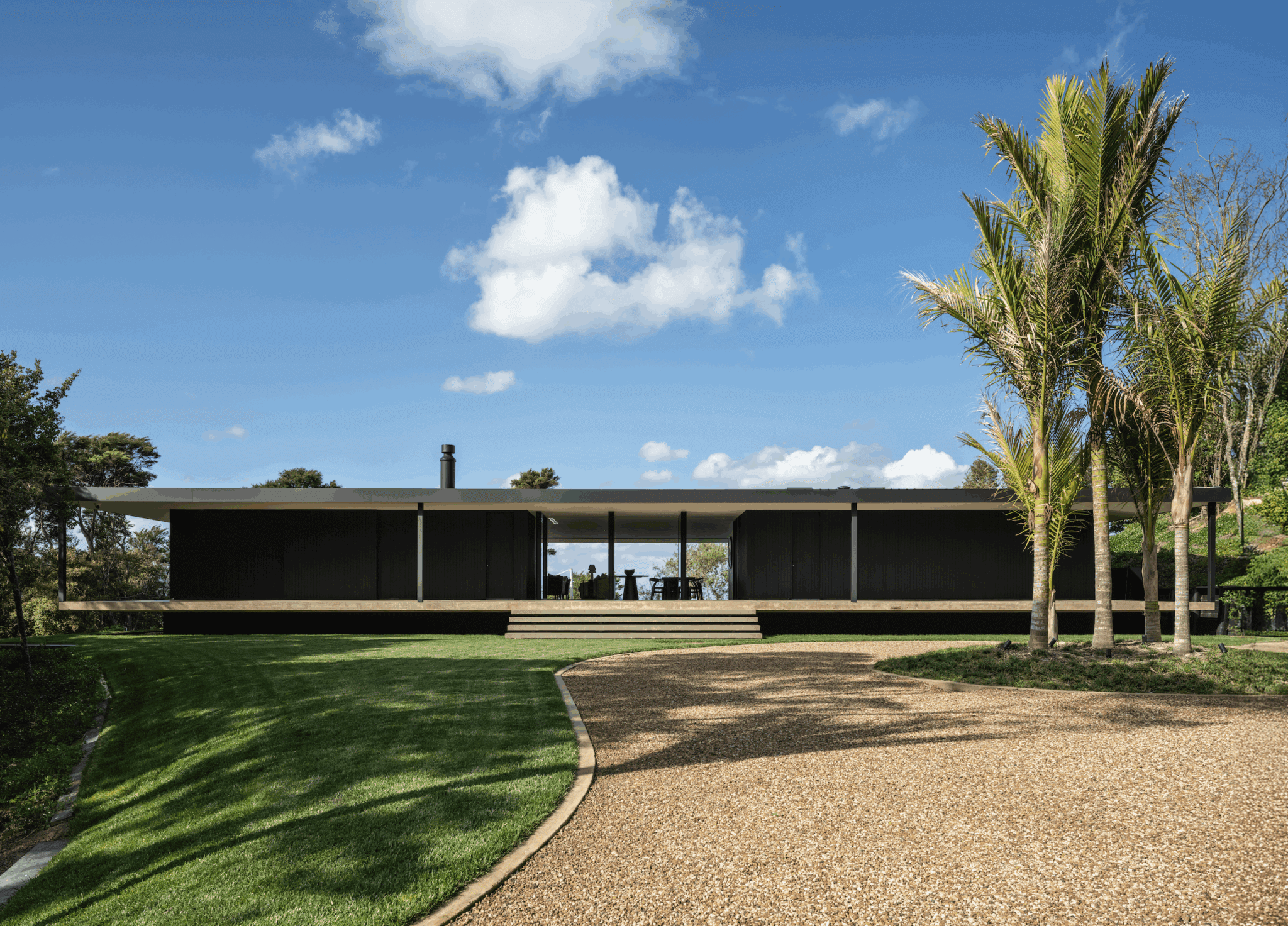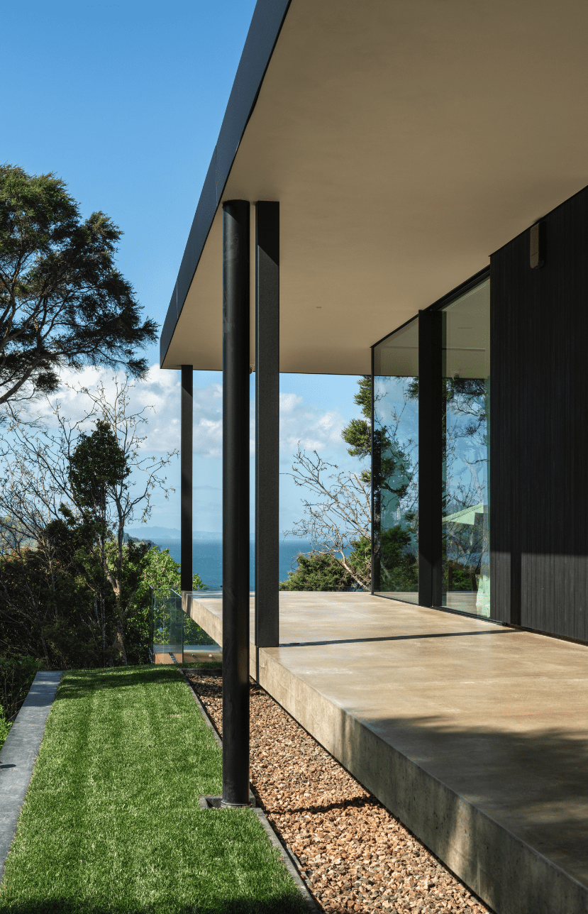 The main home reads like a precise line within the unruly native landscape. As architectural designer Chris Tate puts it: “A piece of machine-edged symmetry; a floating form, still and precise in the bush.” The linear form expands to fill the clearing along a north to south axis.