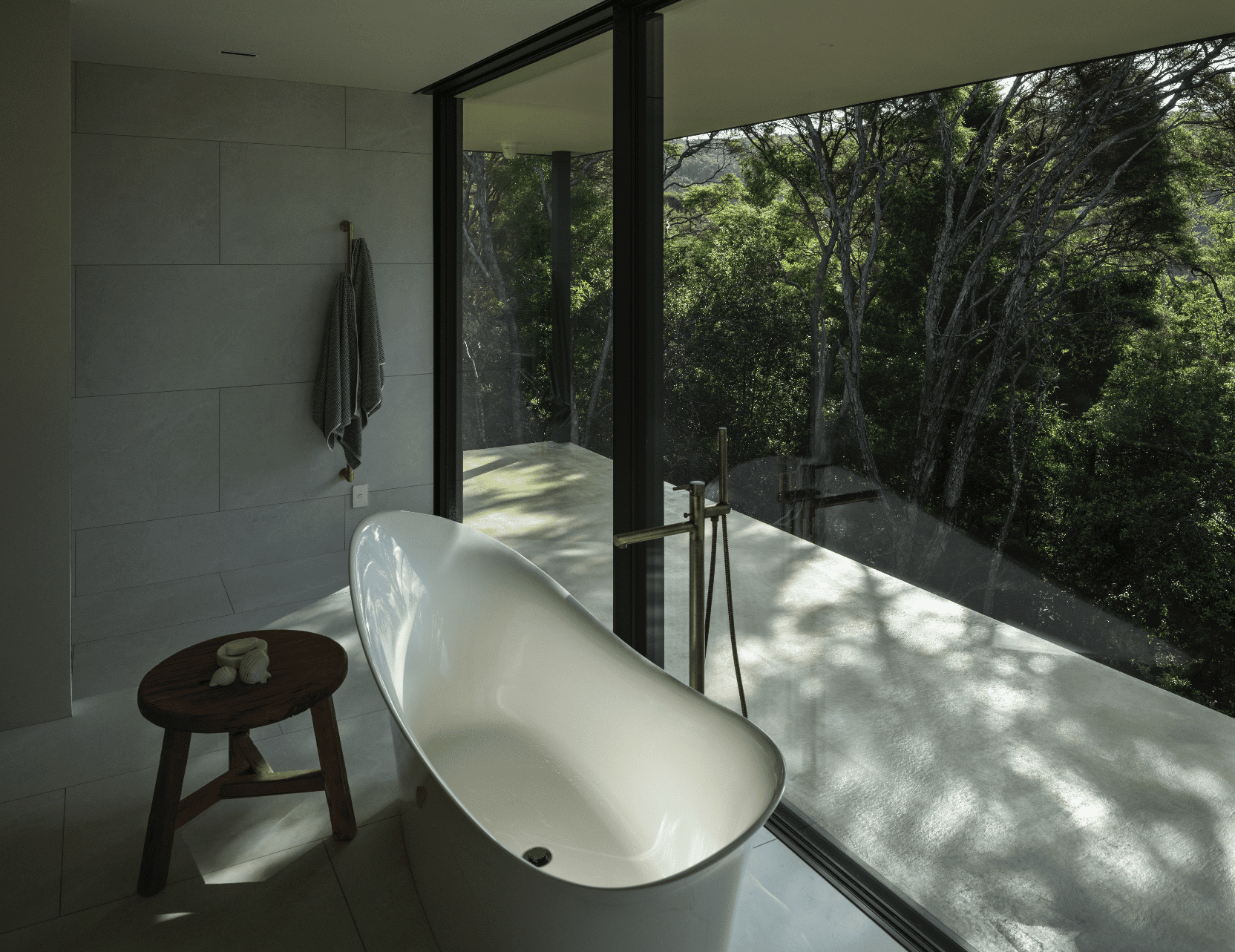 “I wanted the primary bathroom to be a space where you could be bathing outside,” Chris says. That’s achieved here with full-height glazing that slides away to open completely to an intimate view of dense bush.
