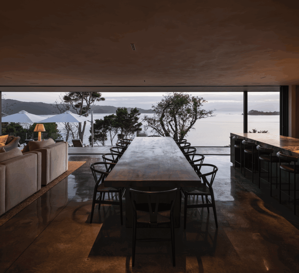 The polished concrete floors extend beyond the glazing to merge interior and deck. Underfoot, the transition is seamless, the outside surface trowelled for texture. “When you’re inside, it’s almost like walking on water,” Jessica says. “It reinforces that floating quality of the architecture.”