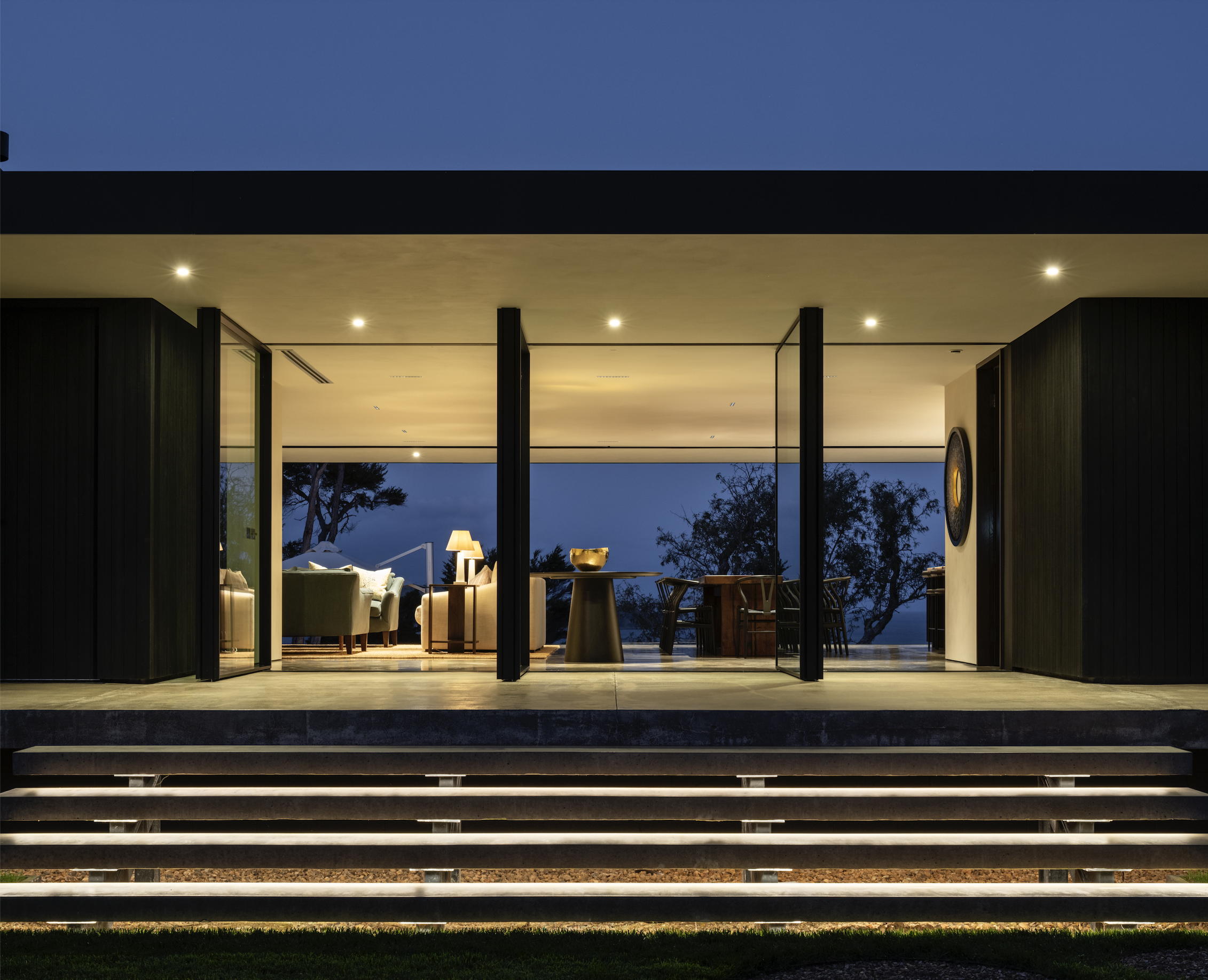 The main home presents itself as a singular, restrained gesture. The dark Abodo meets 12 metres of glazing — Vitrocsa floor-to-ceiling glazed doors that can slide away into discreet pockets, allowing the facade to dissolve completely. A two-metre-deep deck wraps the building in its entirety, creating a relaxed arrangement of openings.