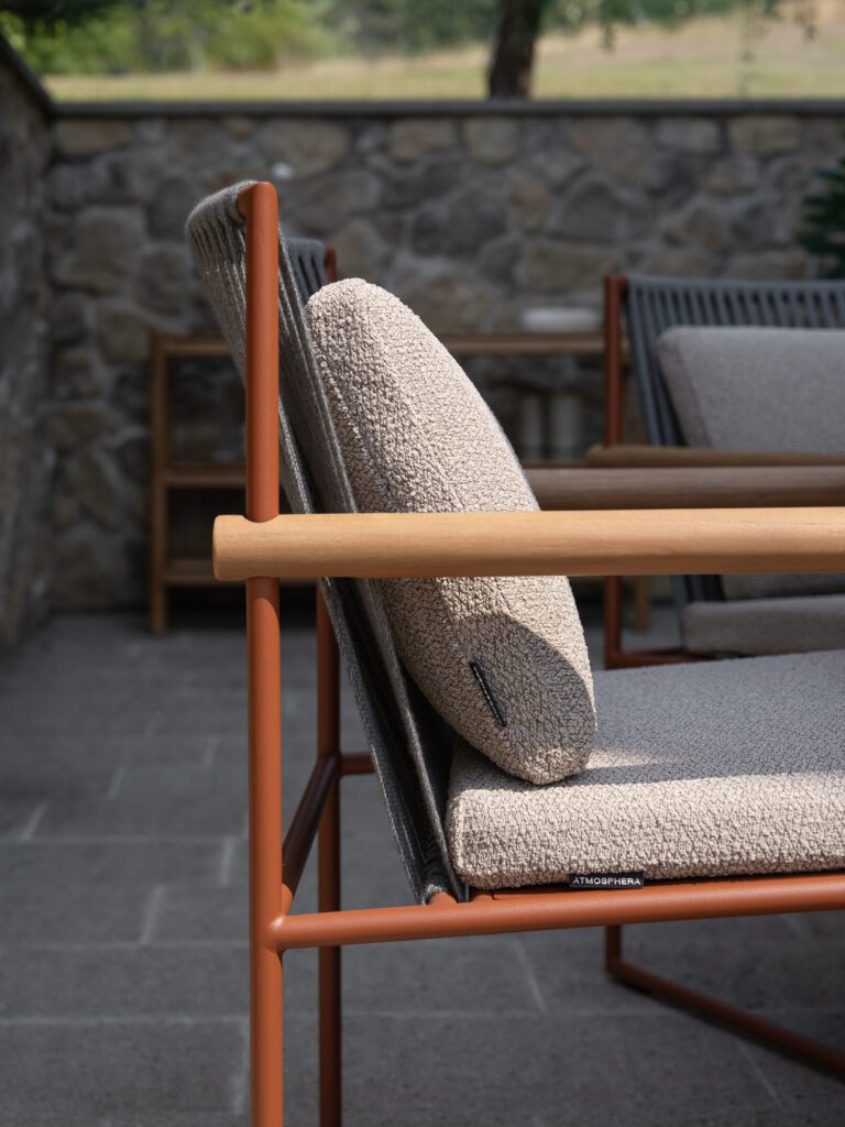 The Pipe Collection is defined by a refined interplay of materials. A slender, powder-coated steel frame, rendered in a distinctive terracotta tone, establishes a clear architectural line. Teak armrests introduce warmth and tactility, while a handwoven grey rope backrest brings lightness and permeability. Together, these elements create a composition that is both robust and nuanced, offering a calm, grounded setting for long afternoons outdoors.