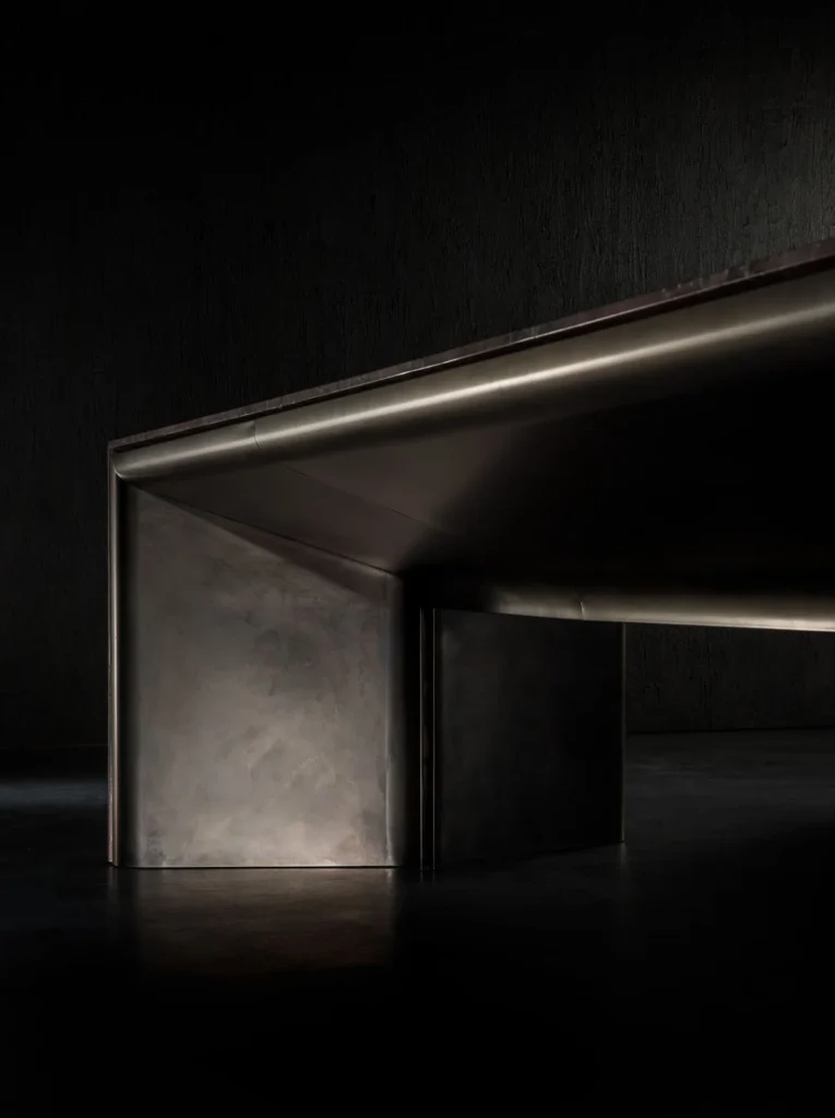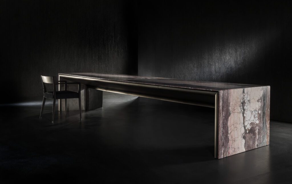 Composed of two complementary, overlapping materials — precious metal and Breccia Medicea dell’Acqua Santa marble, an exceptionally rare stone that has been celebrated since the Renaissance — the Alter Ego table by Henge balances contemporary style with traditional craftsmanship. It is a piece that makes a serious statement: iconic, organic, and pure in its linearity.
