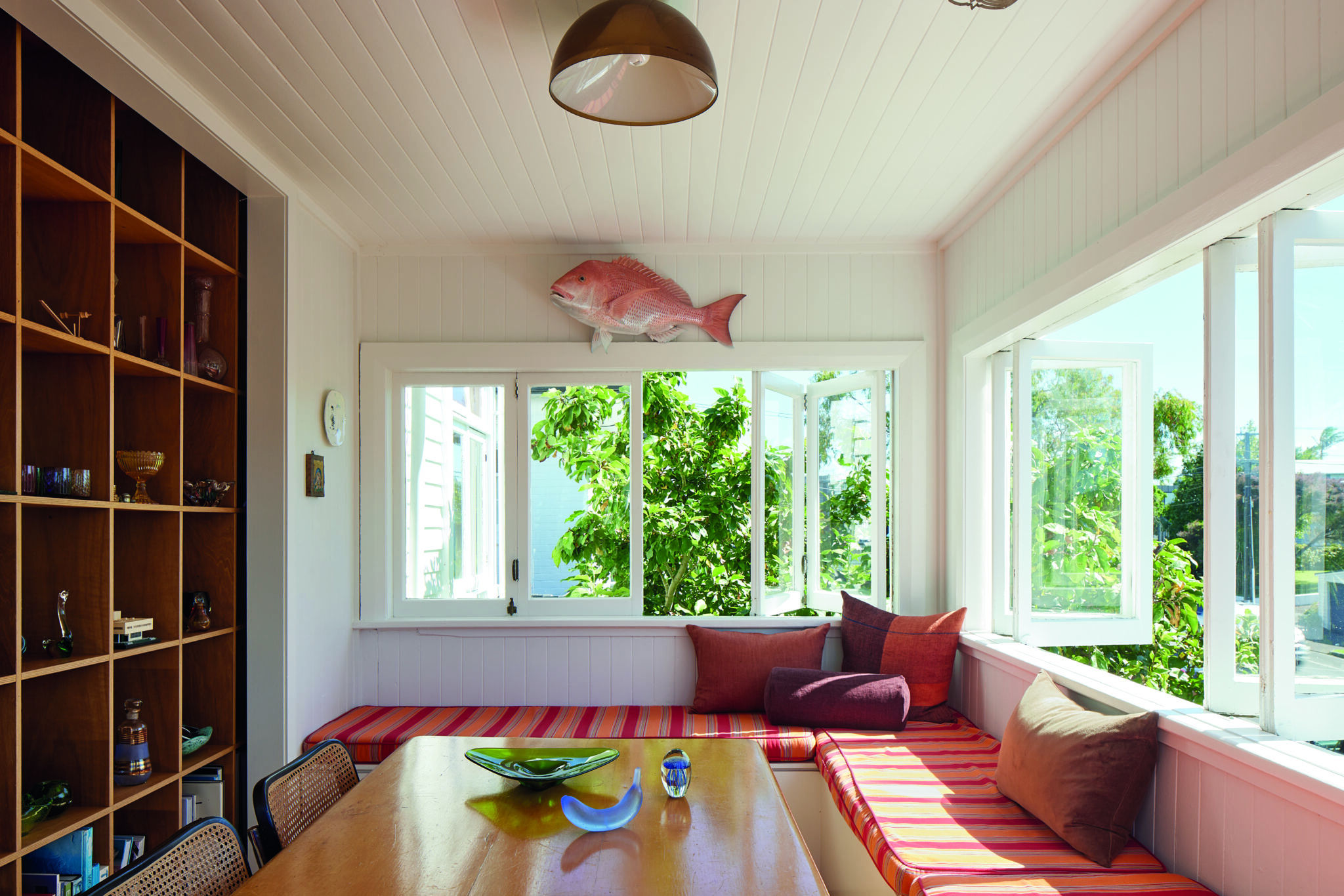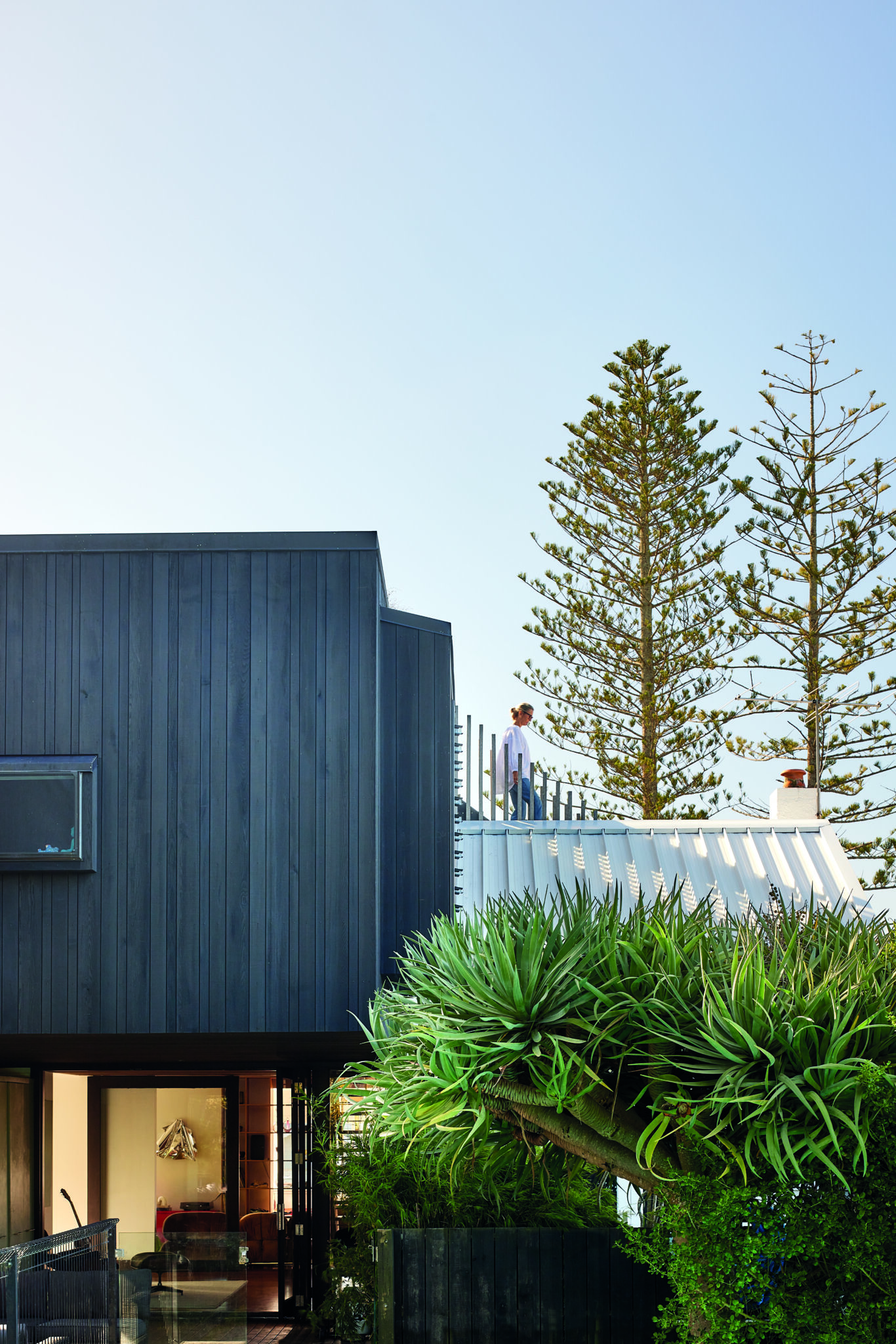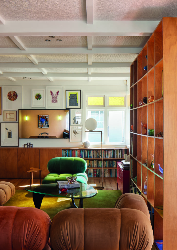 Outdoor living is layered and generous. The garage roof has been reinforced and planted as a north-facing lawn, expanding the usable area and offering an elevated platform for family life. A substantial front deck extends directly from the kitchen, framing sea views and stepping down to the lawn, while timber bifold doors at both front and rear dissolve the boundary between interior and exterior. Internal sliding glass doors allow the plan to be opened or closed as required, supporting both convivial gatherings and quieter retreat.
