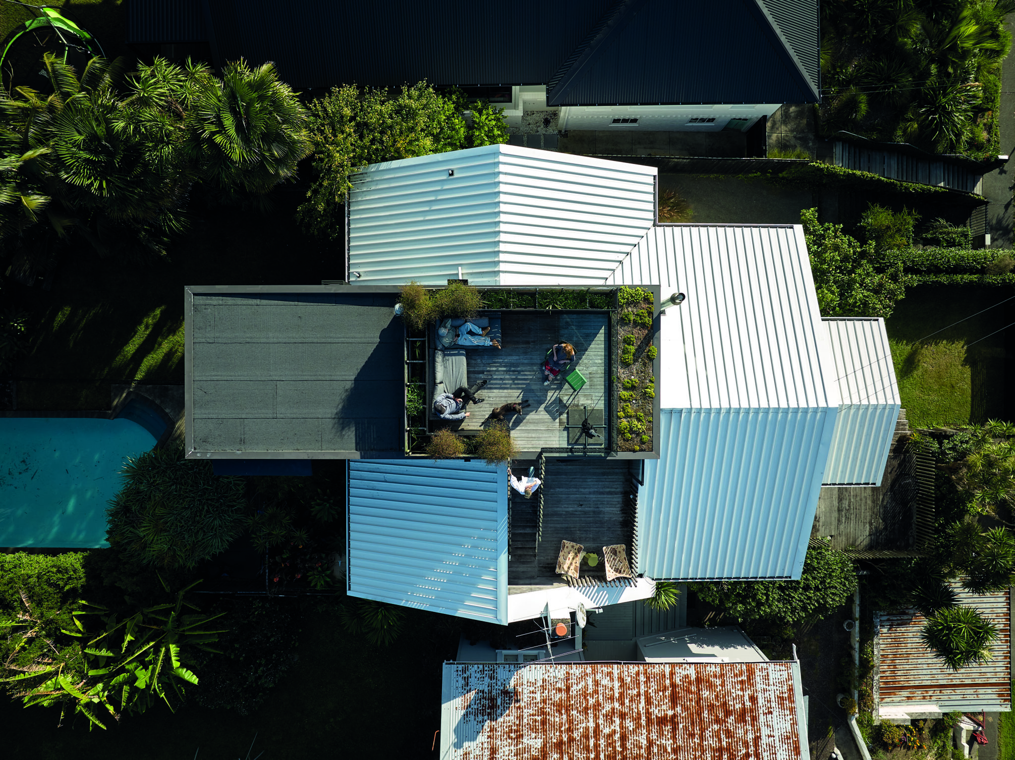 Originally a modest bungalow with compromised planning, the house has been reimagined and extended bu Dorrington Atcheson Architects to embrace sun, outlook and connection. The redesign resolves the site’s dual orientations: predominantly north-facing living zones are paired with a south-facing pool courtyard, creating a sequence of spaces that move fluidly between light, shelter and view. Bedrooms have been repositioned to the rear for acoustic calm, while a new two-car garage at street level establishes a clear, private entry in place of the former shared access.