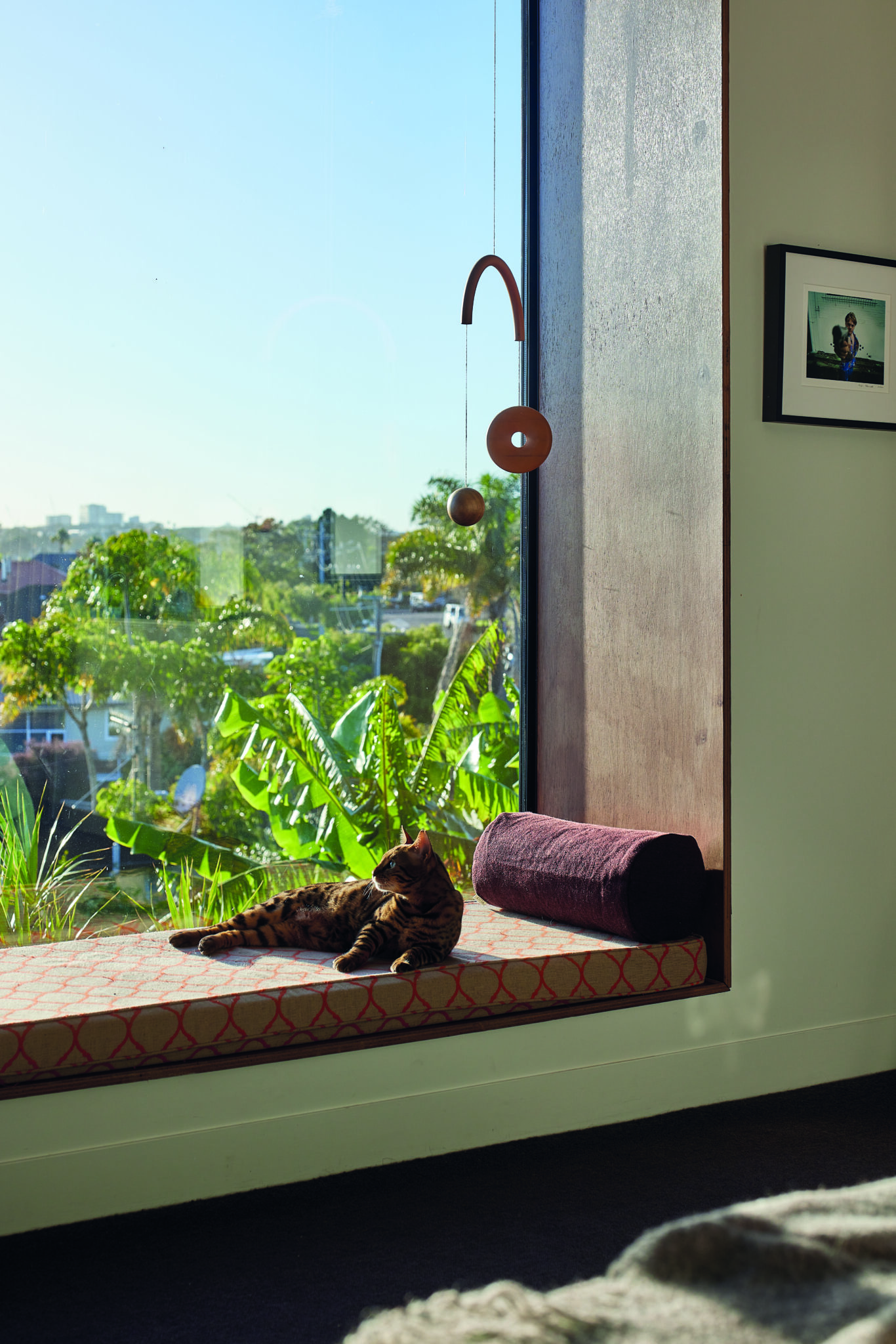 A defining gesture is the timber-clad modernist box extruded from the rear of the original structure. Cantilevered above the pool terrace, it houses the primary suite, bathroom, office and a secondary living room, with a private deck overlooking the water. Below, the overhang creates a sheltered poolside zone — a shaded, resort-like setting for summer entertaining. From here, stairs rise to a rooftop deck commanding expansive sea and city views.