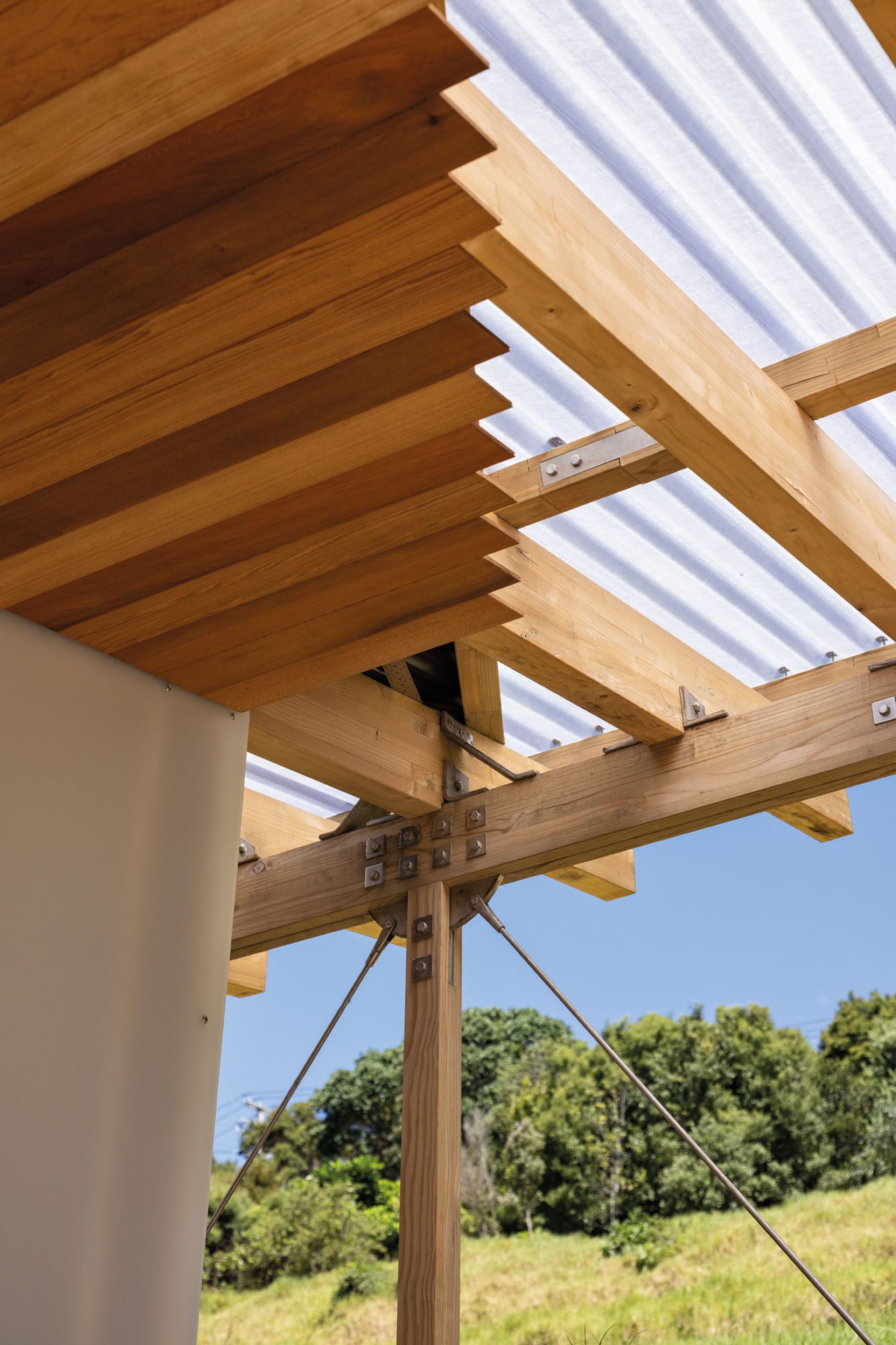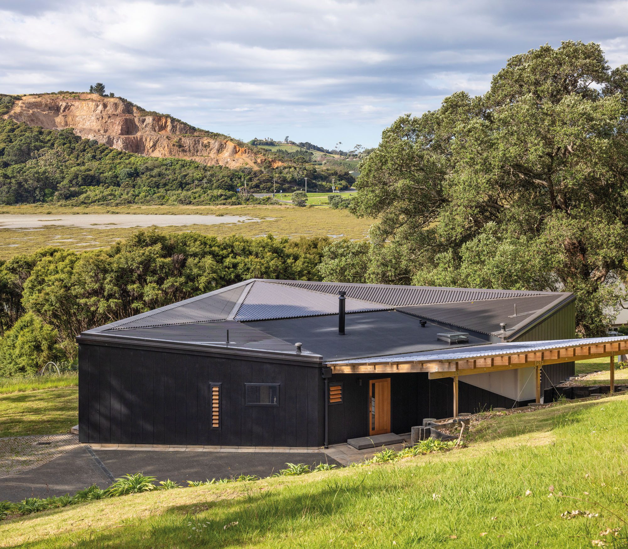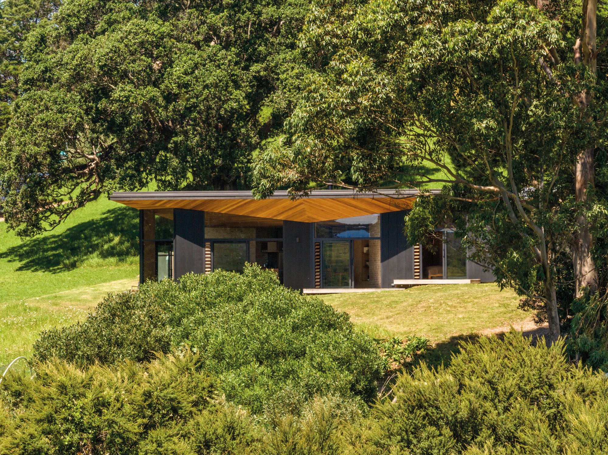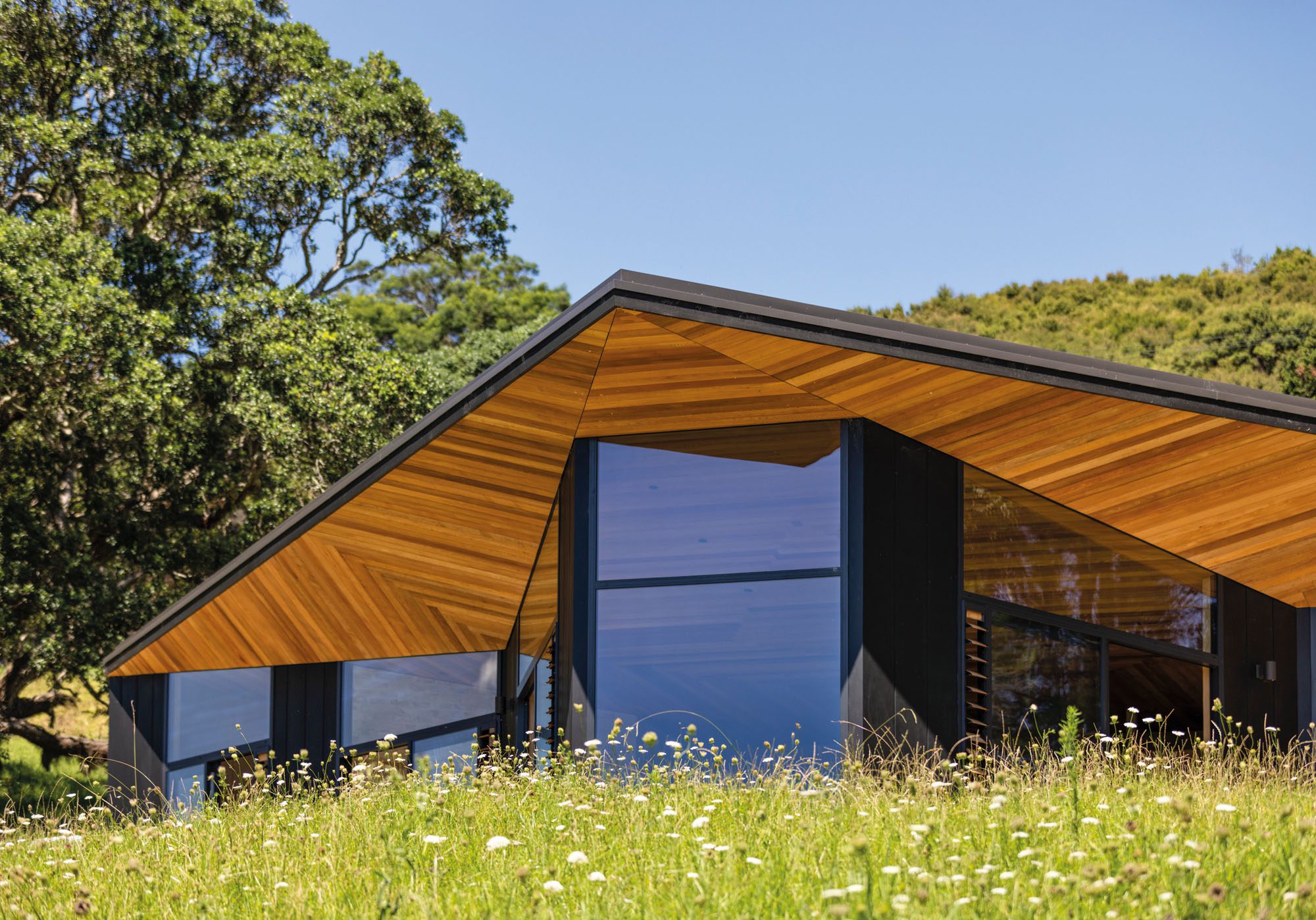 When architect Vaughn McQuarrie first walked around the site, he bent to pick up a fallen pōhutukawa seed pod. In that instinctive, unnoticed moment, a design was born. The pod’s four-pointed shell, opening out to reveal points like a compass, echoed the clients’ wish: a house that might somehow resemble a bird in flight.