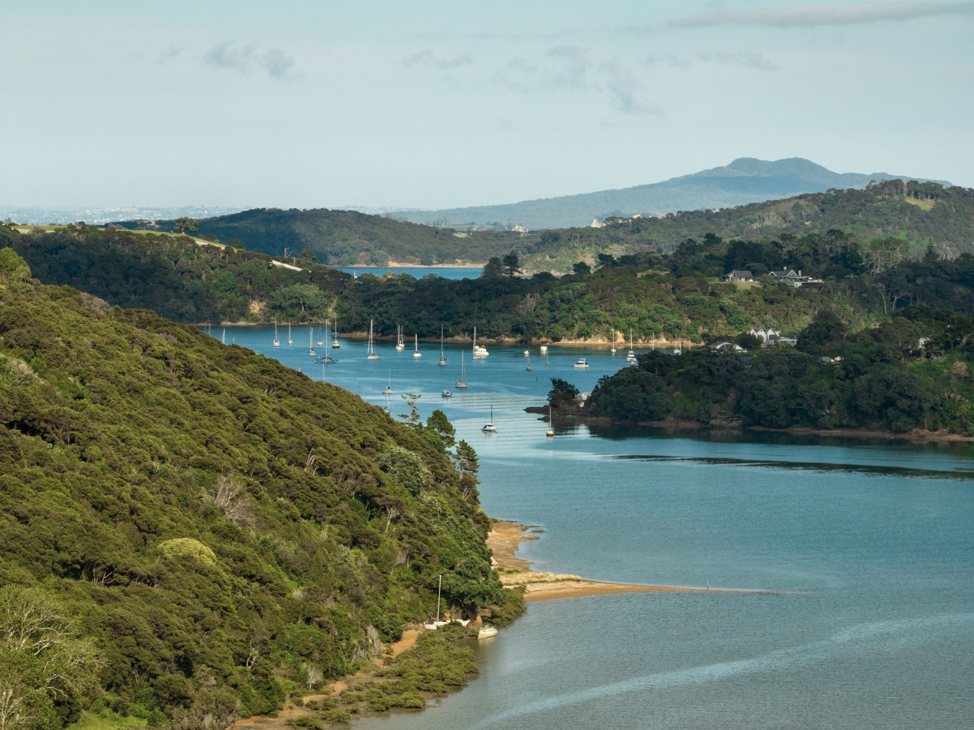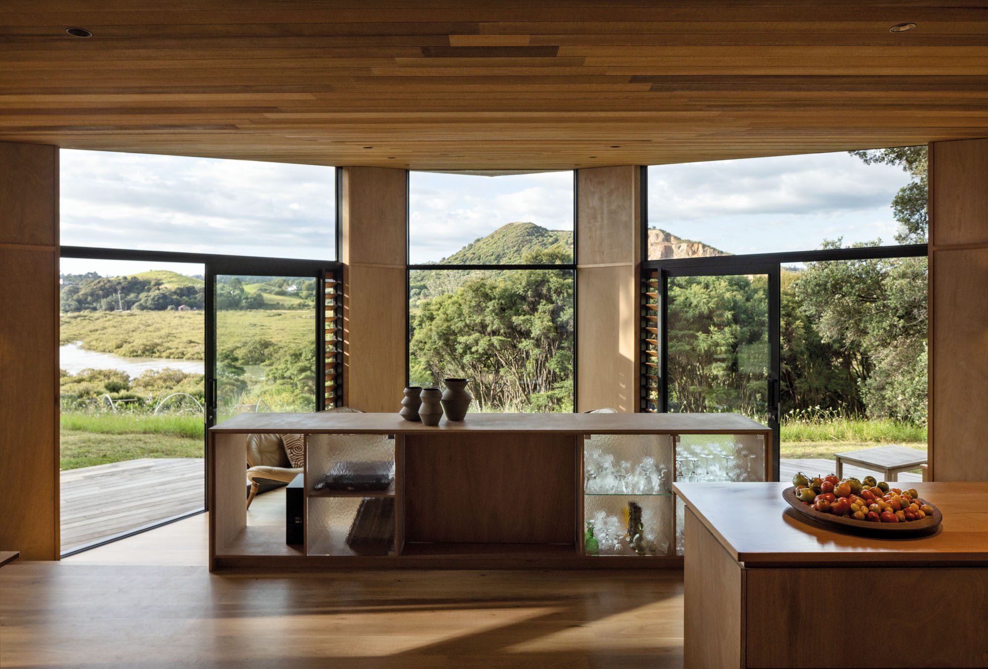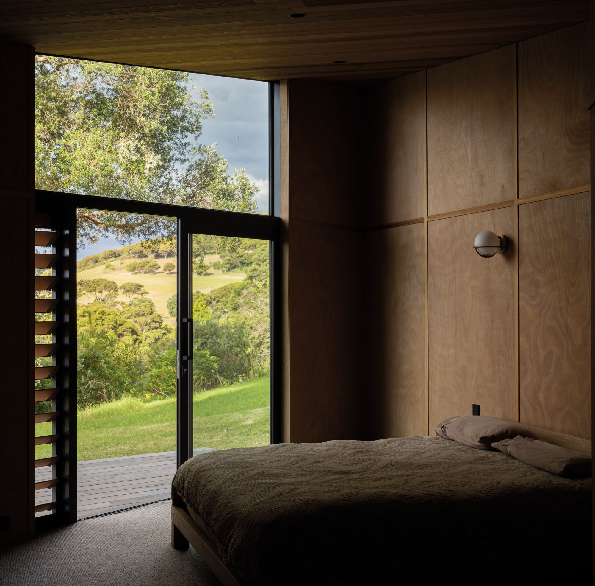 The plan is deceptively simple. Two bedrooms flank the centre: one facing an old pōhutukawa; the other, the sea. Between them, the living spaces cascade gently down the slope, the kitchen to the east, the dining room to the west, the living room stepped down to embrace the view; at every moment, this design breathes with the site.