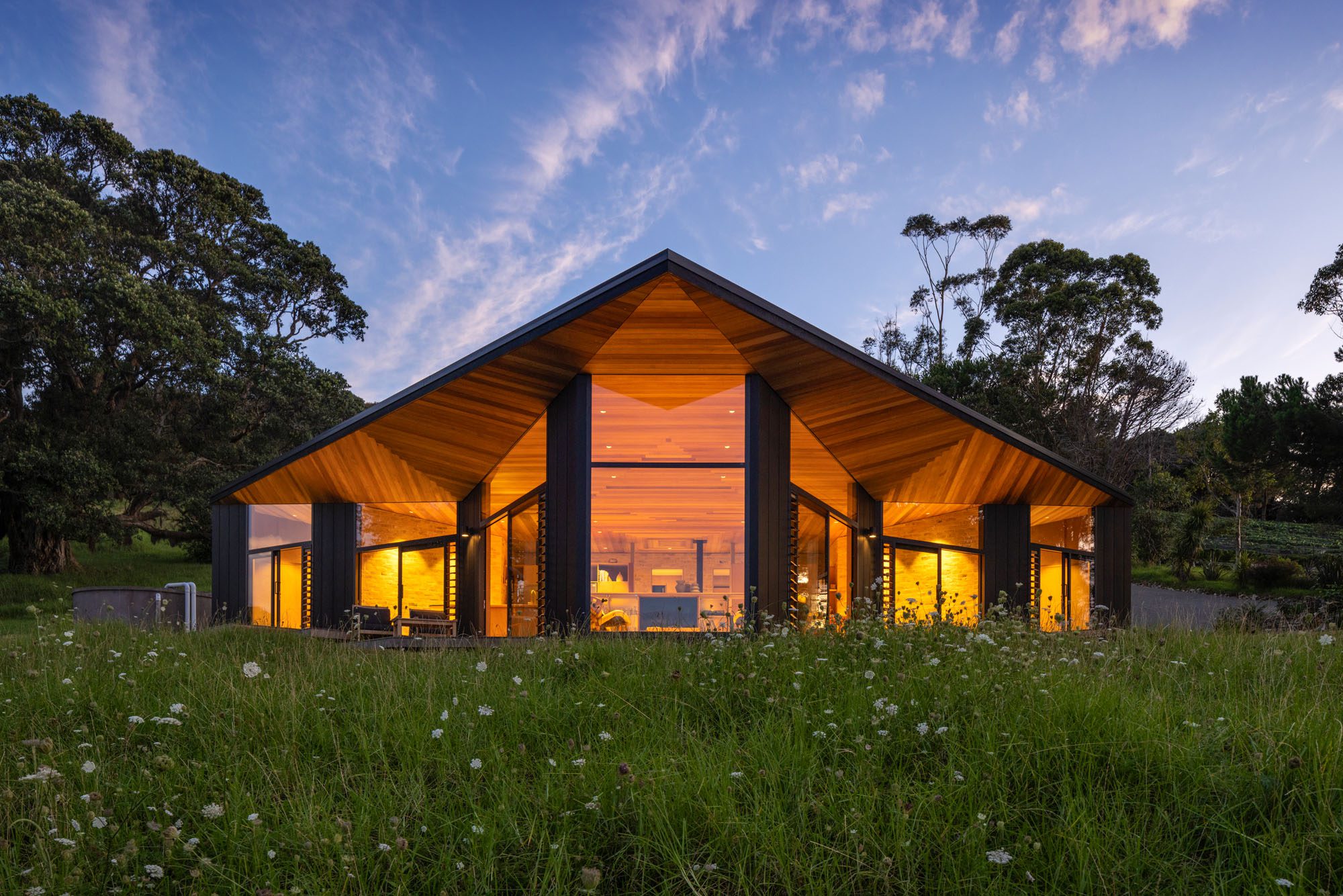Vaughn folded a square of paper, turning the corners inward, then outward again, so it resembled wings lifting. That paper model became the essence of the home: a form drawn upwards at four points, its roofline soaring like feathers caught on the wind.