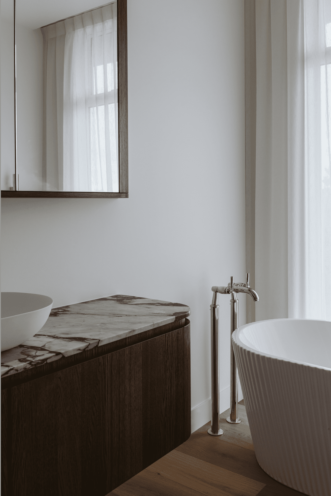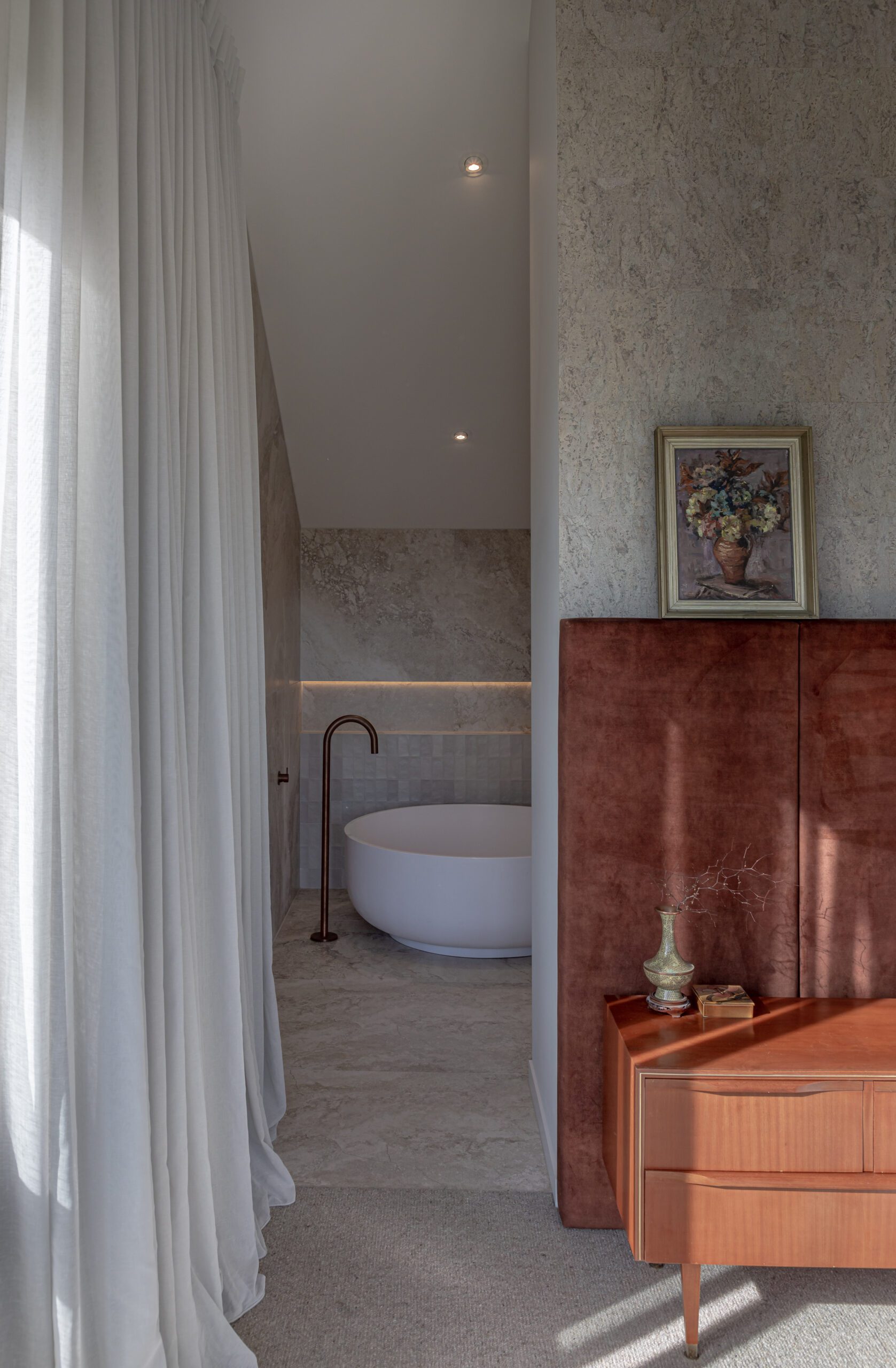 In a villa renovation by Jones Architects, interior firm Sticks+Stones Design crafted a small, unassuming en suite that packs a big punch.