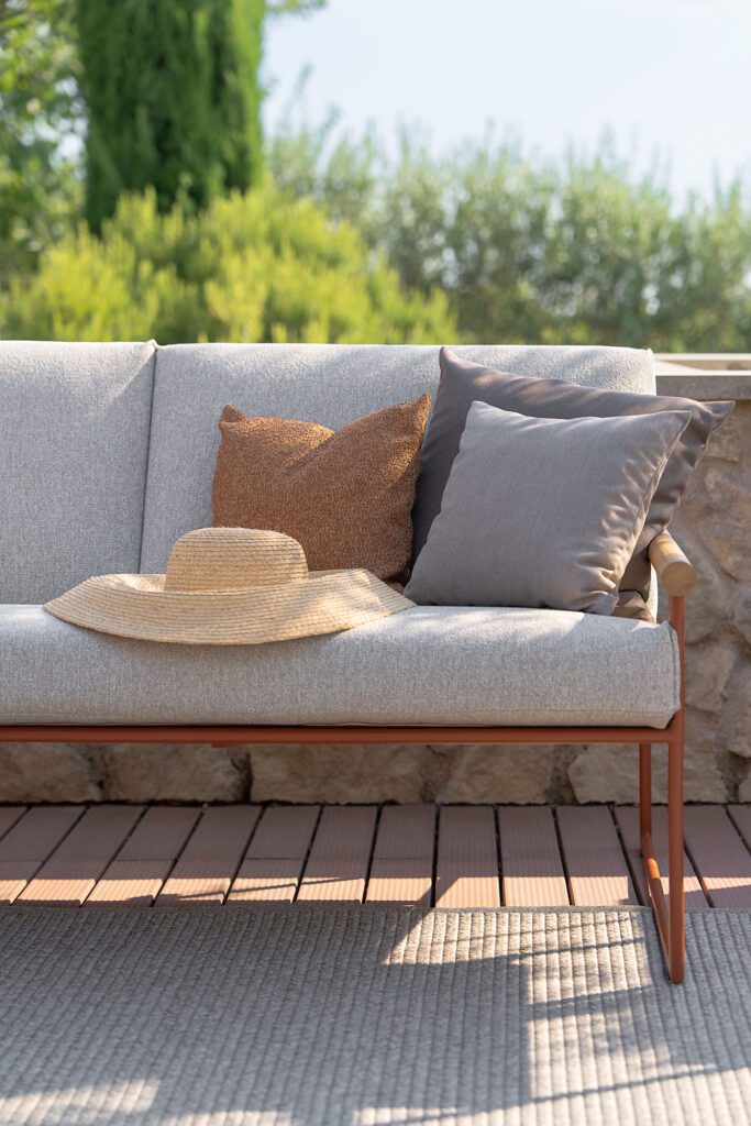 The living space opens visually to two adjacent outdoor areas, giving the house a subtle Brazilian modernist inflection: a blend of sculptural mid-century sensibility, rich natural materials, and seamless connection to the views. Details such as rattan kitchen cabinetry and the expressive Gubi 1972 pendant (bamboo slats hand-sewn into a pleated mat) complete a scene worthy of the sun-drenched hills above Ipanema.