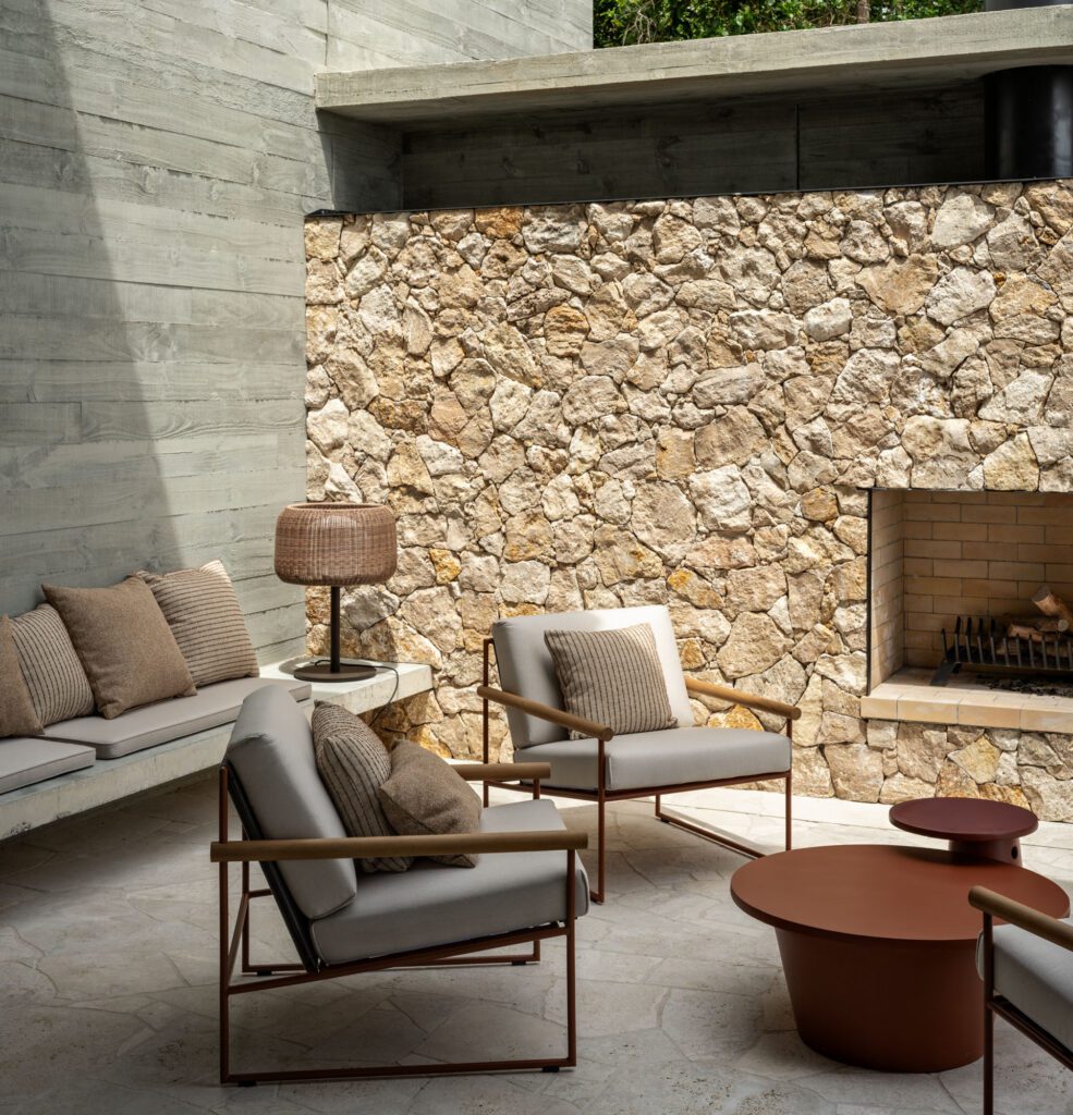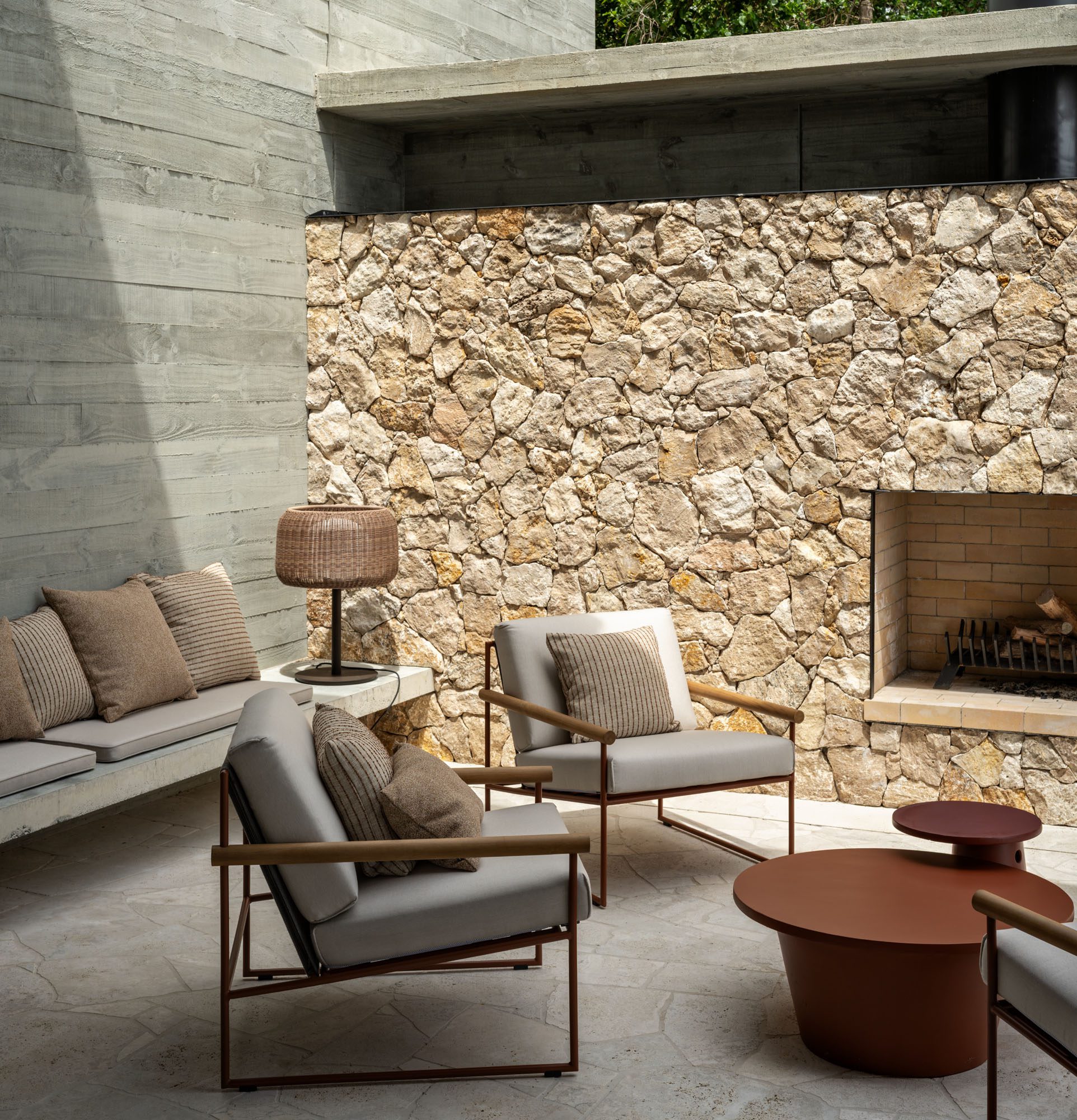 Freeform-cut Scala Travertine tiles from Eco Outdoor set a pale background for furniture ranging from an older timber dining table to pieces from ECC, Cult, and Studio Italia. A sculptural concrete bench, timber-lined ceiling, and carefully proportioned wood fire (F.L. Bone’s Cheminées Philippe Radiante 692) contribute to the room’s composed atmosphere.