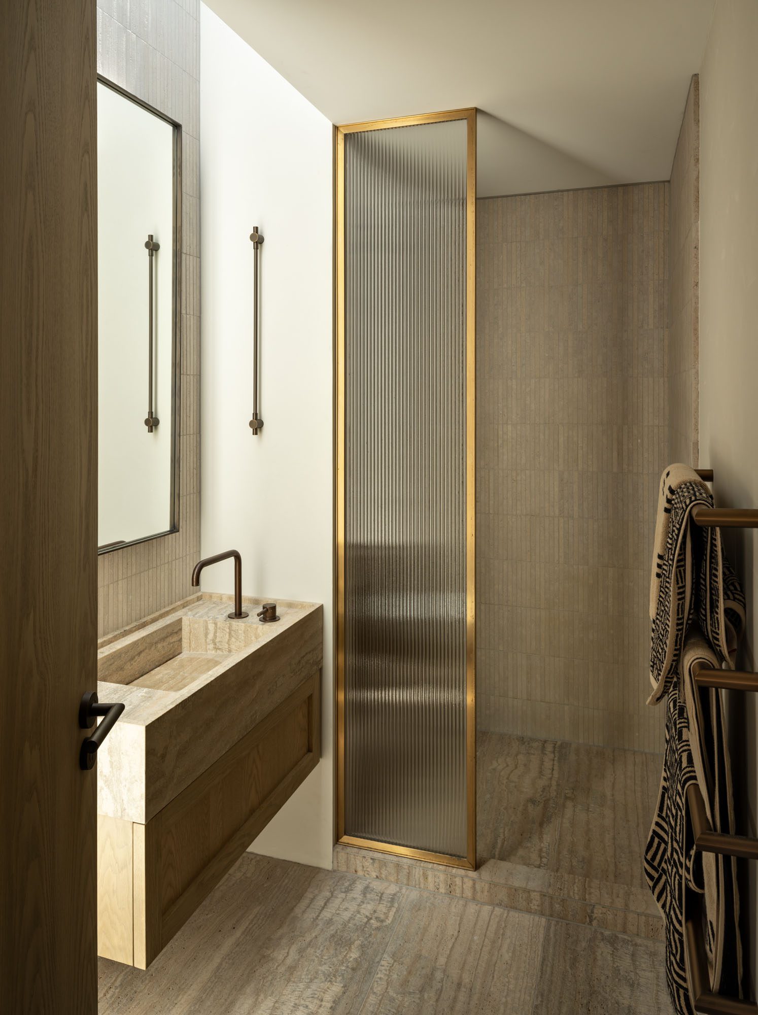 Bathroom detailing is exquisite: organic brass accents, fluted glass, and generous overhead natural light.