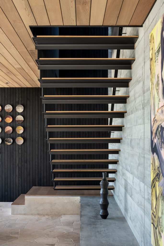 The sectional pivot is a suspended stair threaded with vertical steel rods, gradually revealing what Julian calls the “living terrace house with a variety of spaces.” The space feels almost suspended, reinforcing the sense that the pavilion floats above the ground. In contrast with the solidity of the entry sequence above, the effect is striking.