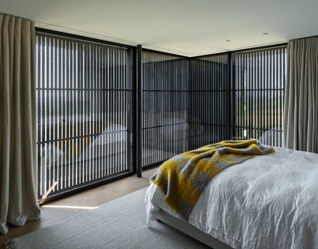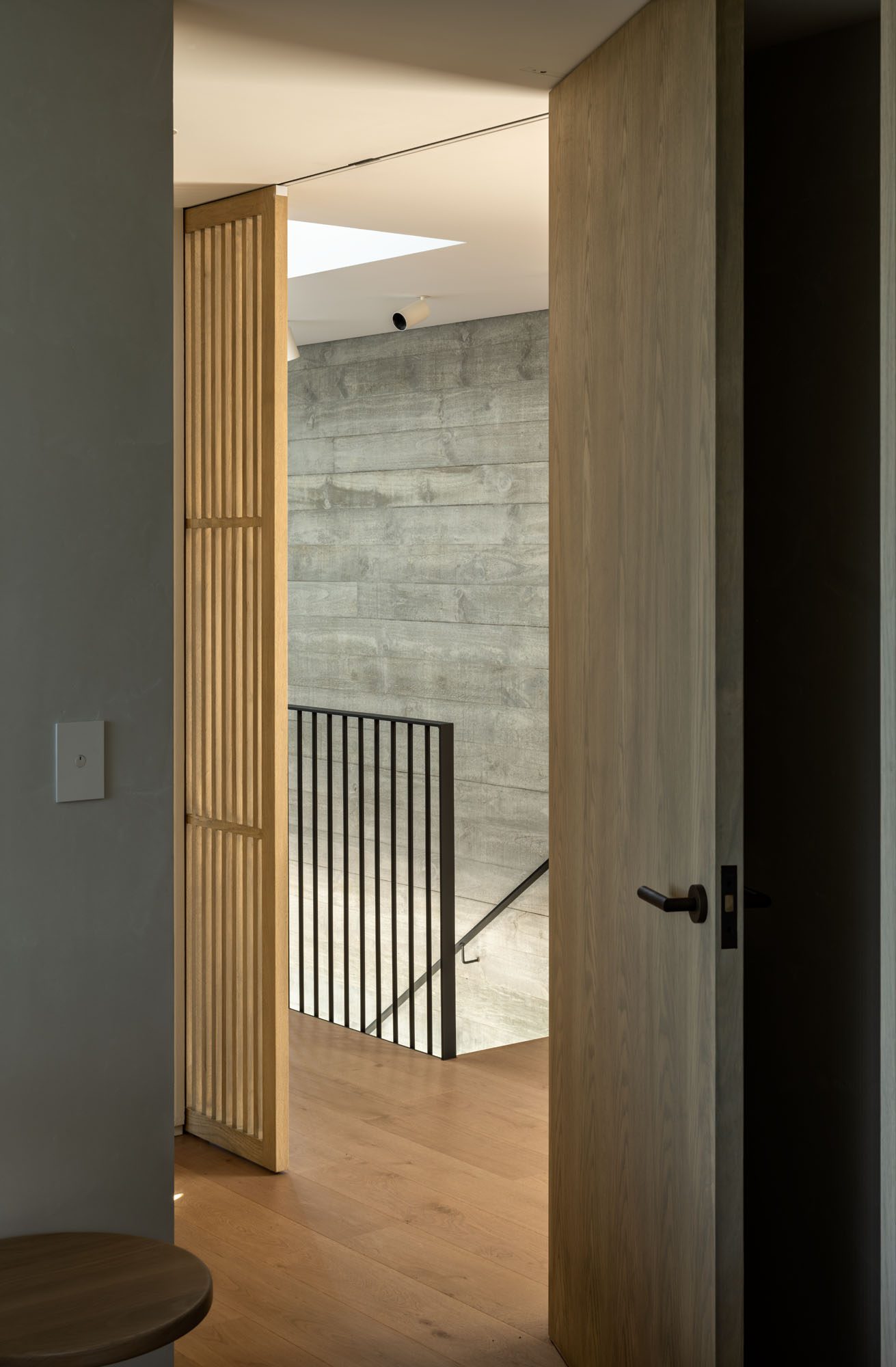 Internally, this means the quality of light is never static; it shifts from dappled and striated to fully bleached as the panels are drawn aside, the room itself becoming a kind of sundial.