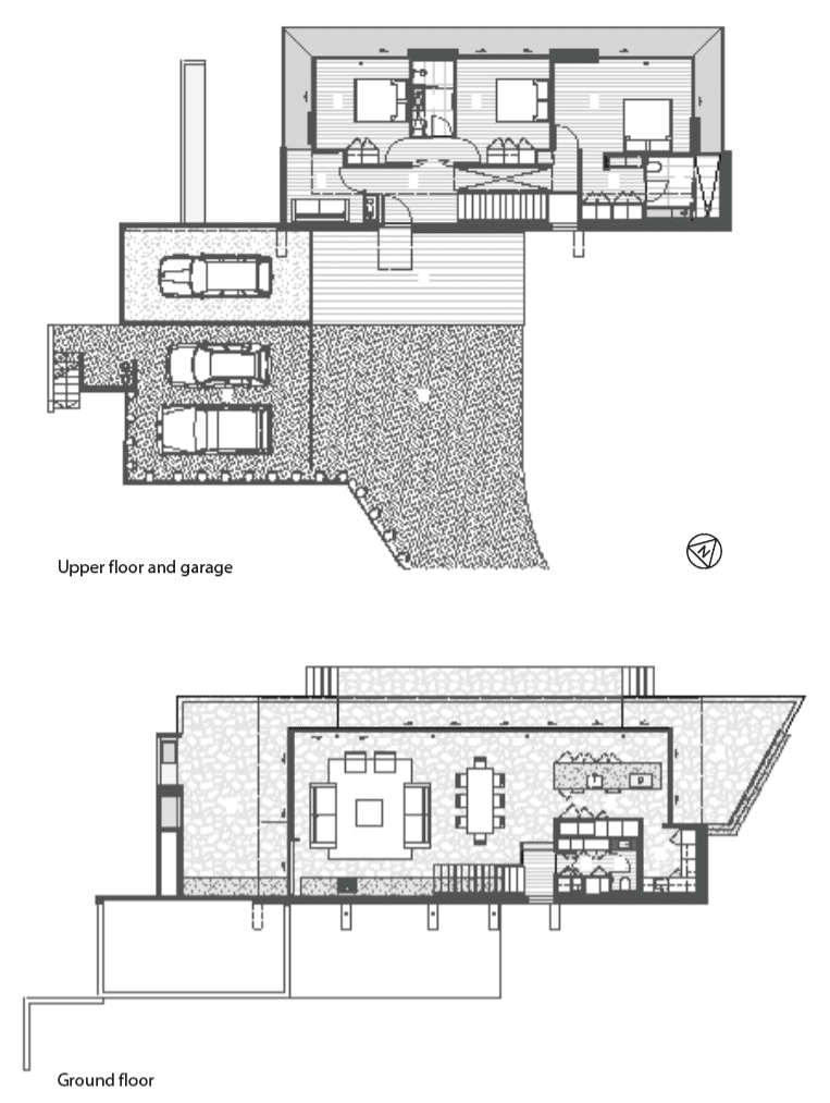 Entry occurs at the compact upper level, where lowered ceilings create a cave-like sense of shelter. Two nearly identical bedrooms share a bathroom, while the main bedroom includes a walk-in wardrobe and ensuite.
