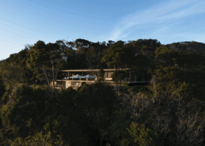 On a rugged, bush-covered site on Waiheke’s east coast, Chris Tate envisaged a floating pavilion — crisp and minimal; an expression of geometric clarity; a vehicle for relaxation, at one with the land and the sea.