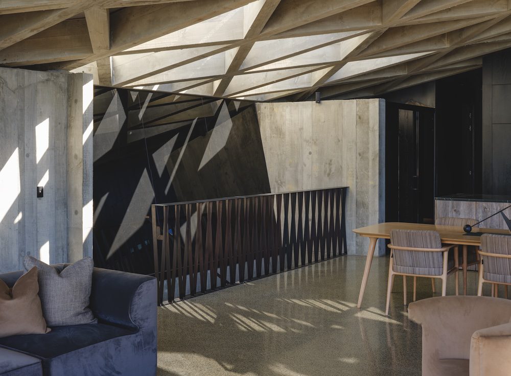 Inside, this delightful dappled effect falls upon concrete expressed in various ways. The floor has been polished; the walls use expressive formwork, while imperfections abound — not as testaments to unpreparedness, but as conscious efforts to let the curing process of the material leave its imprint upon the finished object.