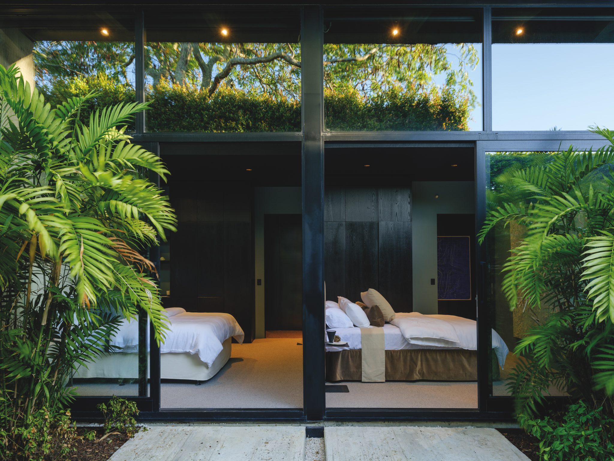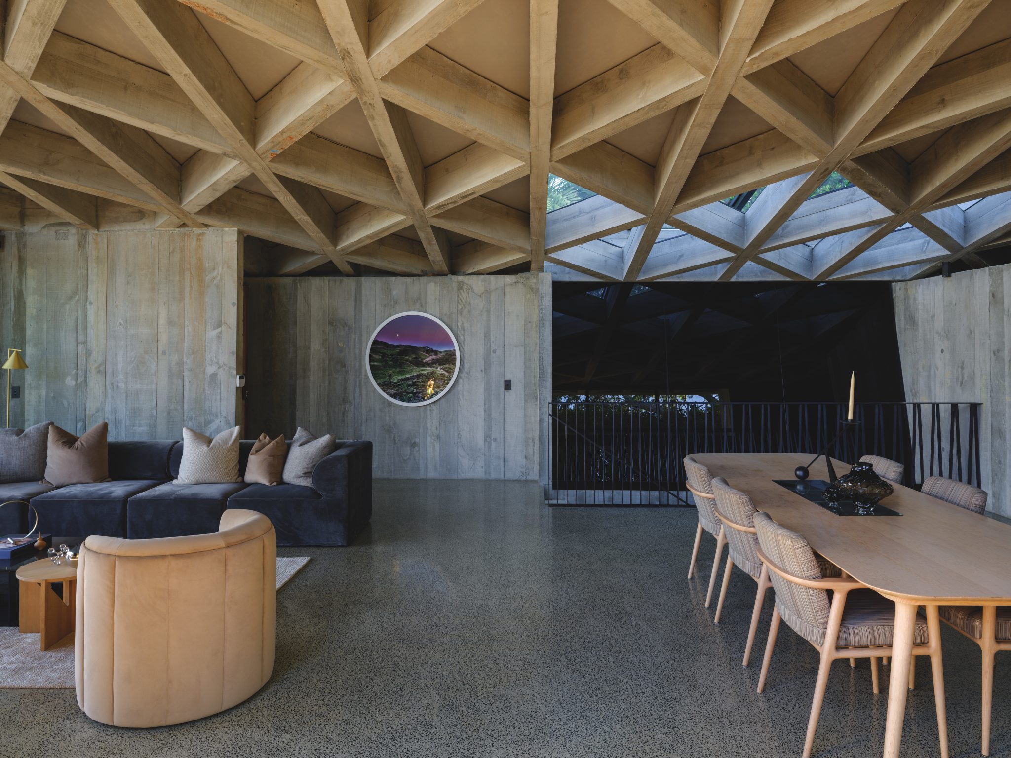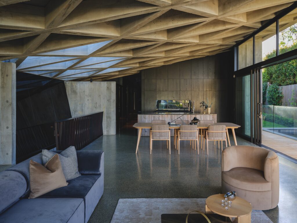 Second came sculpture. A grid-like lattice of intersecting concrete ribs was used as a roof. This 56-tonne exoskeleton was balanced above the home in a dramatic monopitch angle that compresses at the southern elevation and releases above the gardens and water feature at the