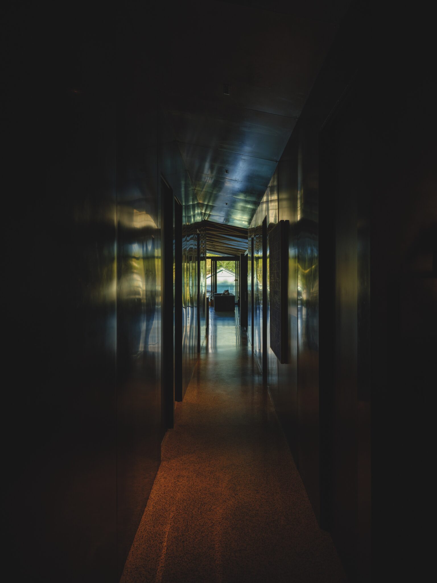 Steel plate in the hallway has been left untreated, its blueish incandescence enhancing the unexpected beauty of the metal. Corten steel in the garden seems oxidised and honest.