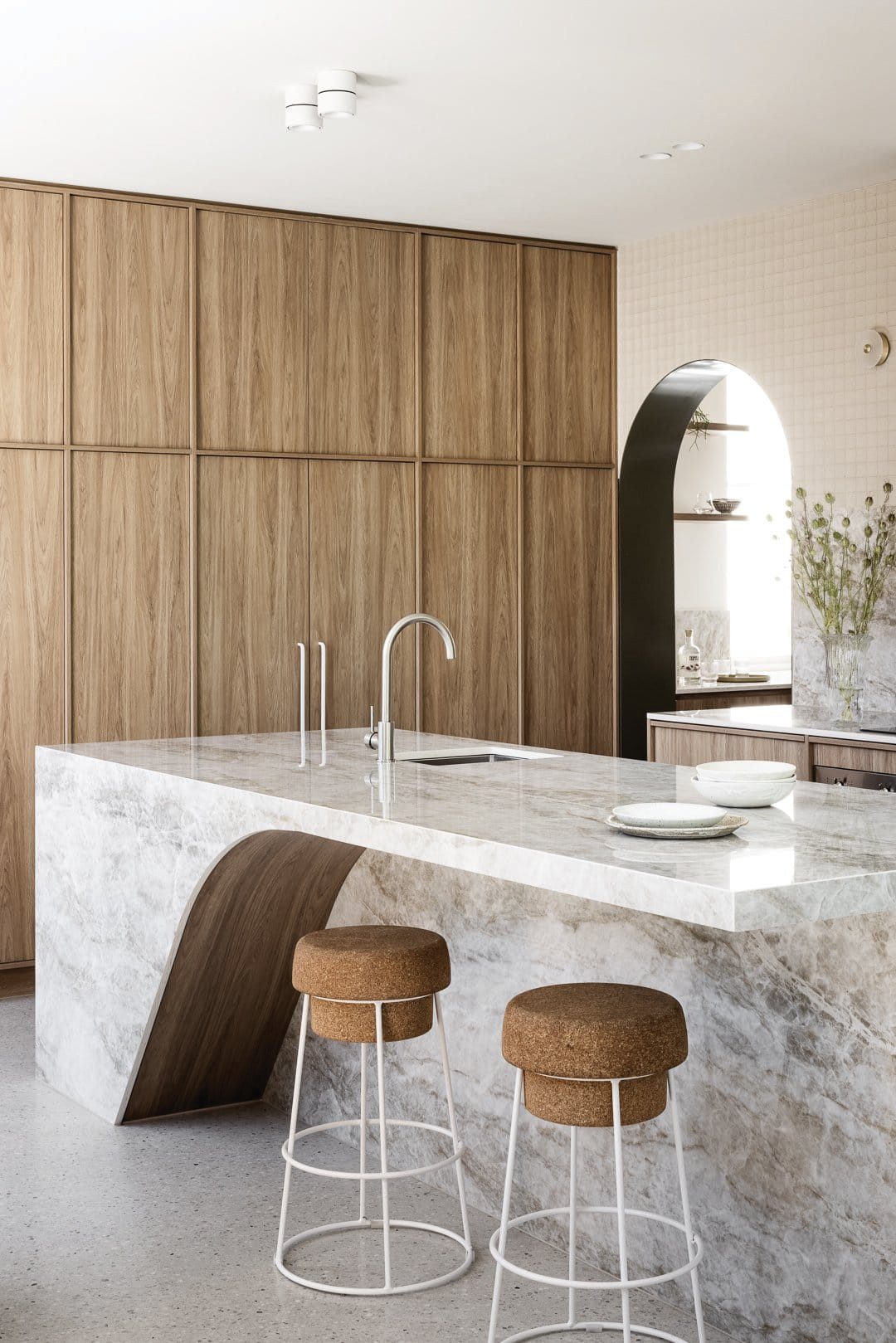 The North House, pictured here, is defined by a thoughtful play of volumes and a warm, calming palette of natural materials. Textural surfaces and organic interior forms create an atmosphere that is at once grounded and refined — a home with a strong identity that balances sophistication with a subtle edge.