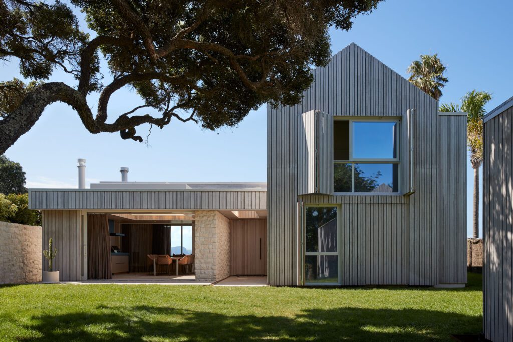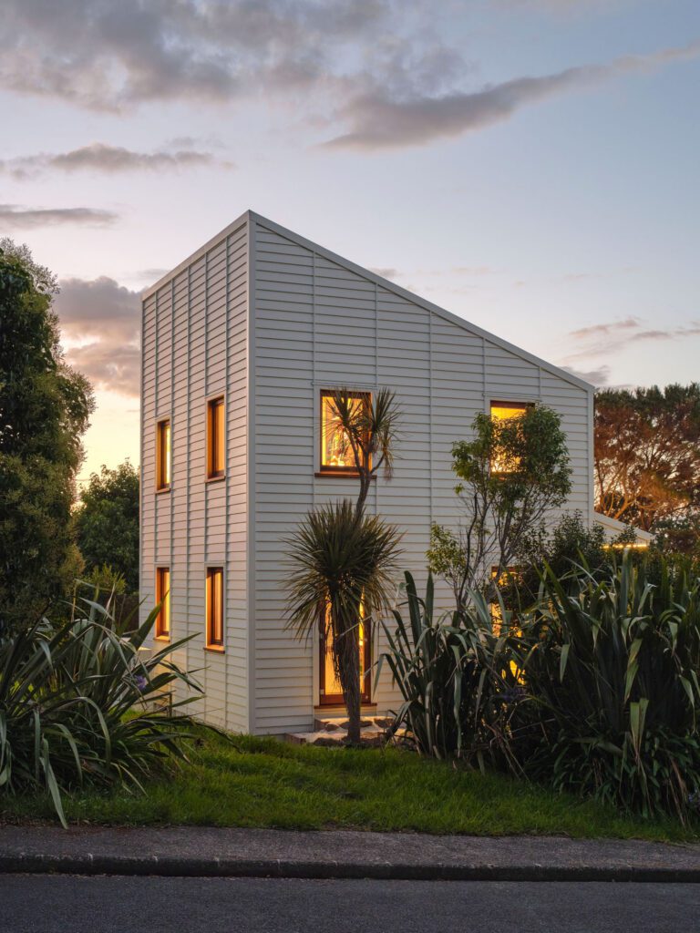 From the street, the little structure presents itself as a classic house: pentagonal elevation, stick chimney, and off-centre criss-crossed window with a solitary lightbulb hanging. It’s like a child’s drawing. Inside, storage benches still bear the scrawled tags of apprehensive children cooped up in the waiting room over the years. Outside, Lake Taupo is writ large, a clipped spread in the bedroom window, filtered and focused all the way through to the bathtub that Rick and Briar inserted into what was the clinic’s old entrance ramp. “The idea is that every space unfolds to the next,” Briar says. “Right from the back you get a sense of the lake because the bach is so small, every room borrows from every other room.”