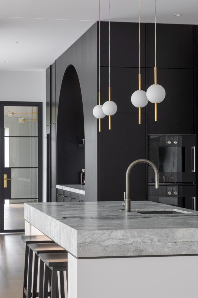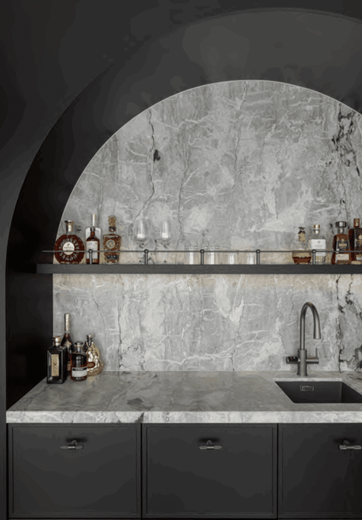 Katie used the stone expansively: on the island benchtop, across the rear wall rising to the high ceiling, and to clad the oversized rangehood for maximum impact. To temper the drama, a fluted concave detail softens the island’s base, its curve echoing the arched form of an adjacent bar where the same stone sits against matte-black cabinetry.