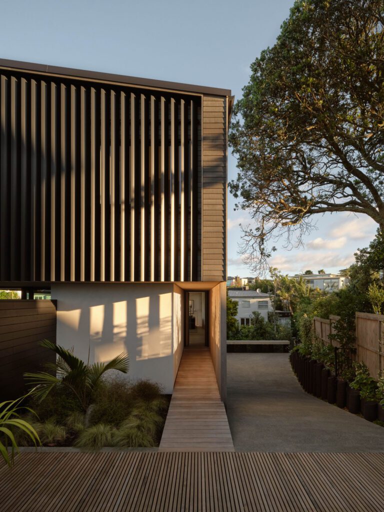 For many years, the Herbsts have explored the ‘language of bones’ often deliberately displaying the junctions, beams and battens of a structure. In recent years, the practice has shifted toward finding new expressions of a structure’s ‘skin’. This house has a taut skin of dark-stained shiplap cedar that fits in with the sky, bush and sea around it. There is beauty and levity in the details – the top floor shifts slightly off the outline of the ground floor, providing a red-painted soffit that adds movement to the façade.