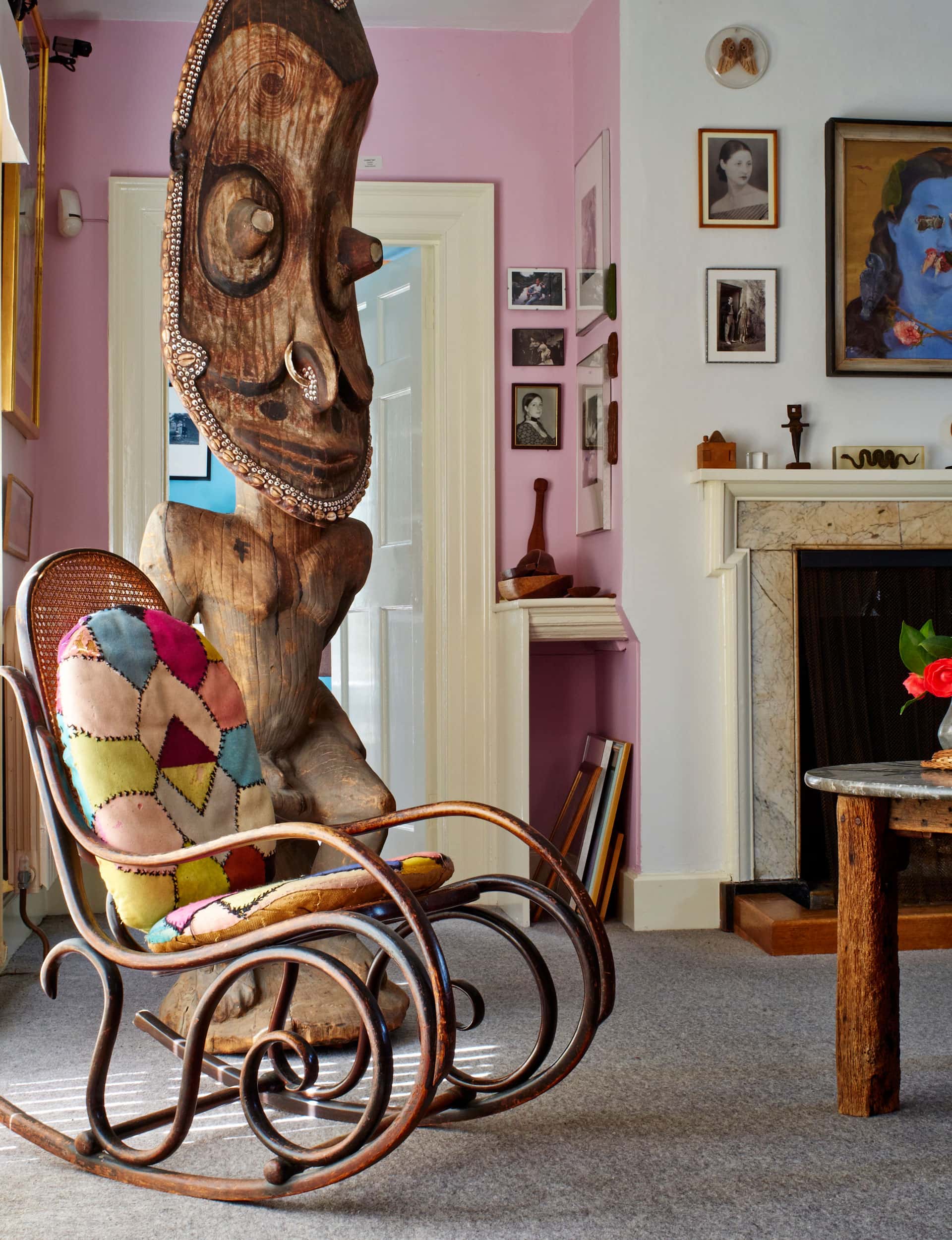 The dining room, where the great and good of the arts world enjoyed Miller and Roland’s hospitality, is particularly powerful. The protective deity of the house, Sir Roland’s mural dominates the walk-in fireplace. The piece depicts a theme of the solar system and the prehistoric ‘Long Man of Wilmington’ that can be seen from the farmhouse. It gives thanks for the abundance that a fortuitous alignment of sun, moon and planets brings to farming. Noticeable to my South Pacific eye is a kava bowl hanging above the fireplace. Antony tells me I’m the first ever to recognise its true purpose. His mother used to fill it with fruit and long, slender candles as a centrepiece for the table.