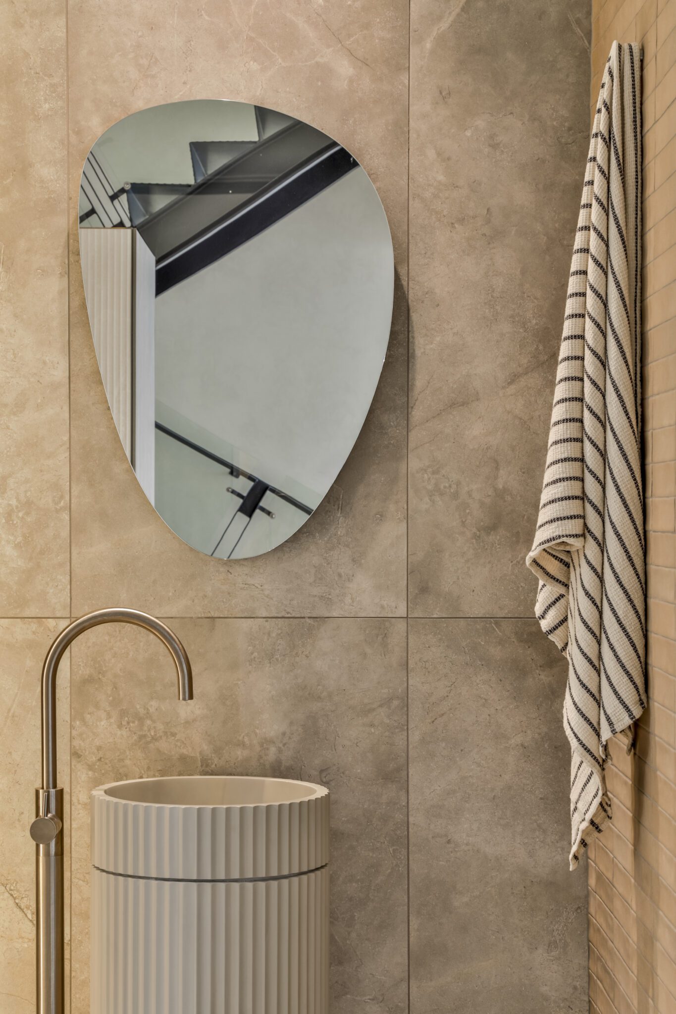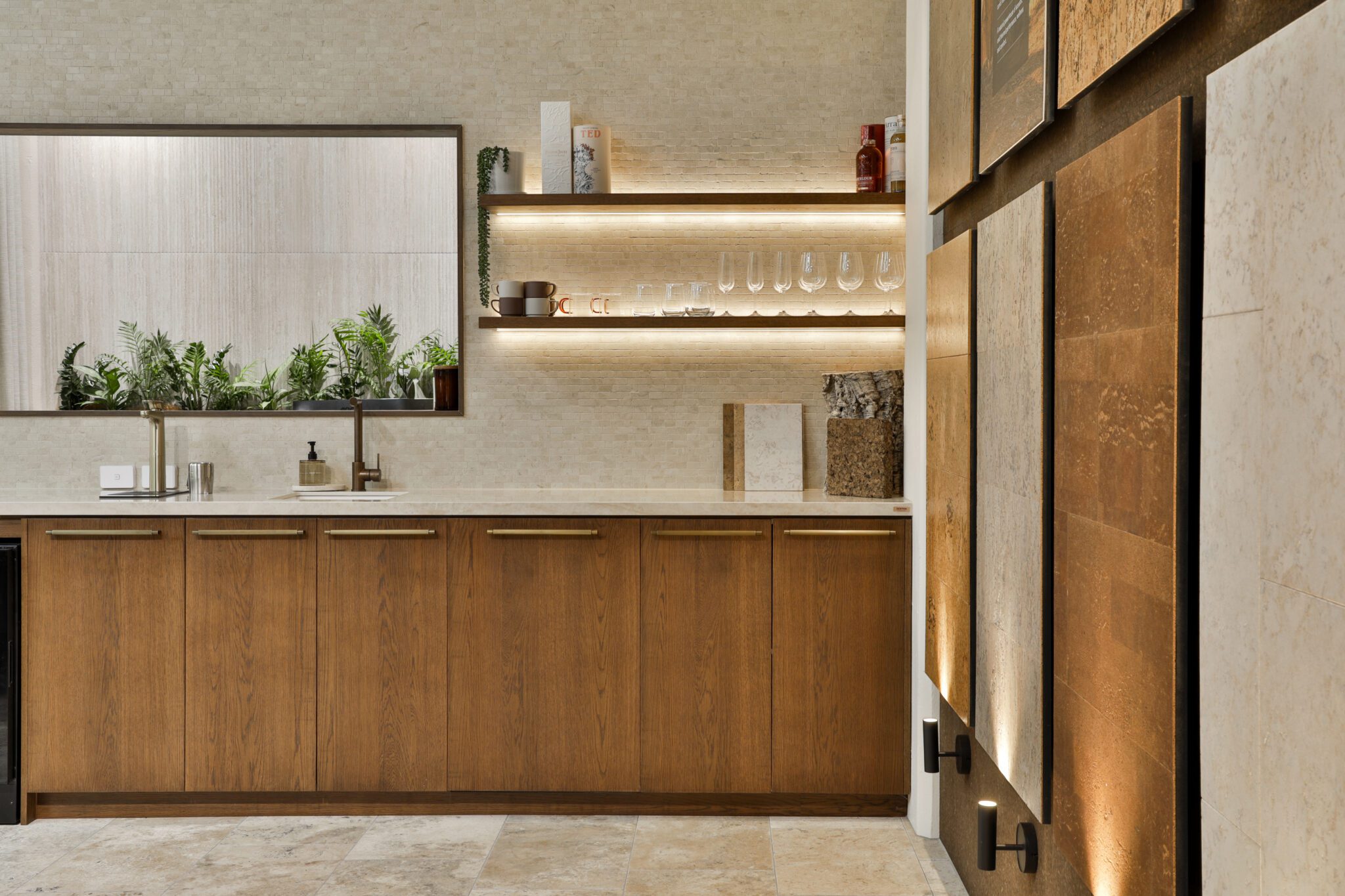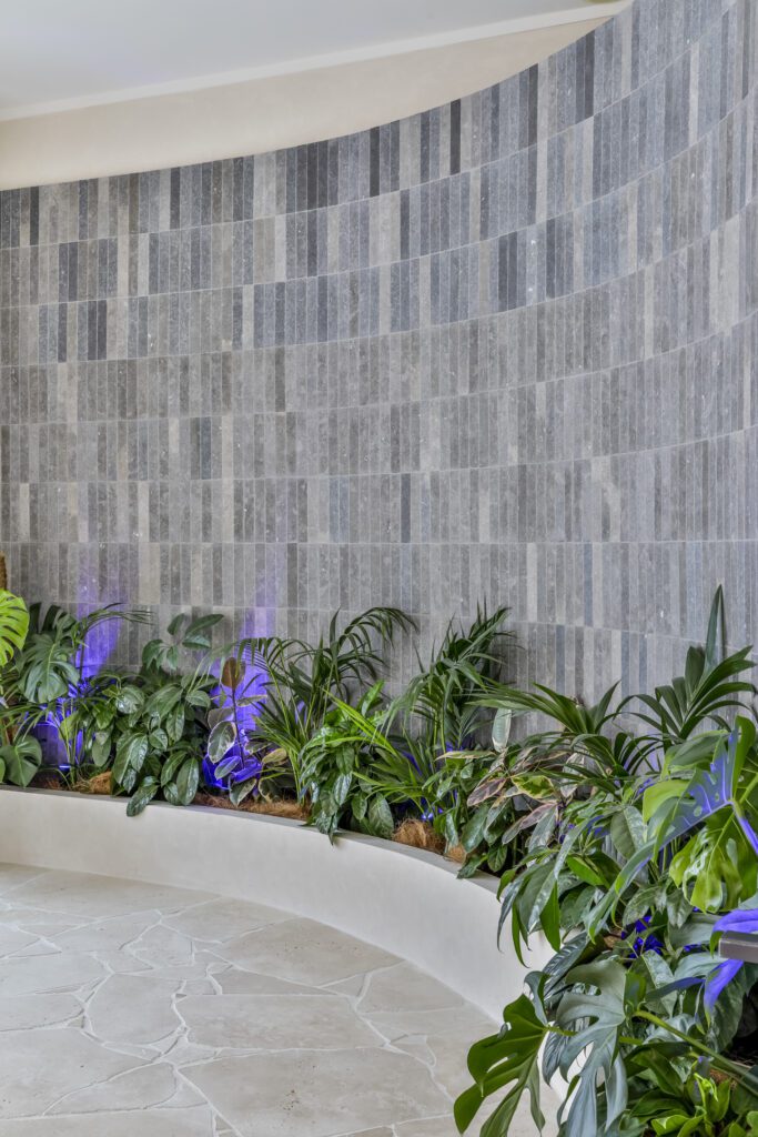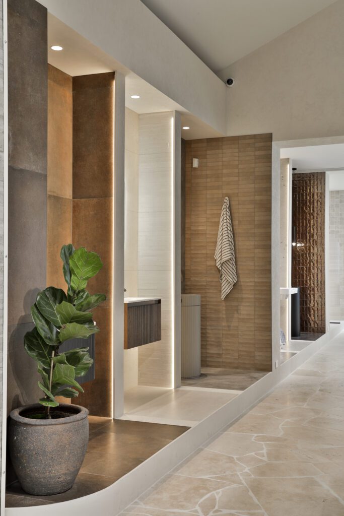 Moving through cork, stone, and tile, the showroom unfolds with a sense of deliberate choreography. Curved tiled walls meet expanses of travertine paving; living gardens thread greenery through the interior; and individual vignettes shift from bold and metallic to pared back, earthen, and refined. Plumbline vanities explore colour and form against tiles while unexpected tiled applications appear in living spaces, challenging conventional boundaries. Throughout, there is an abundance of texture, colour, and sensuous detail — a showroom that sparks ideas and invites both inspiration and touch.