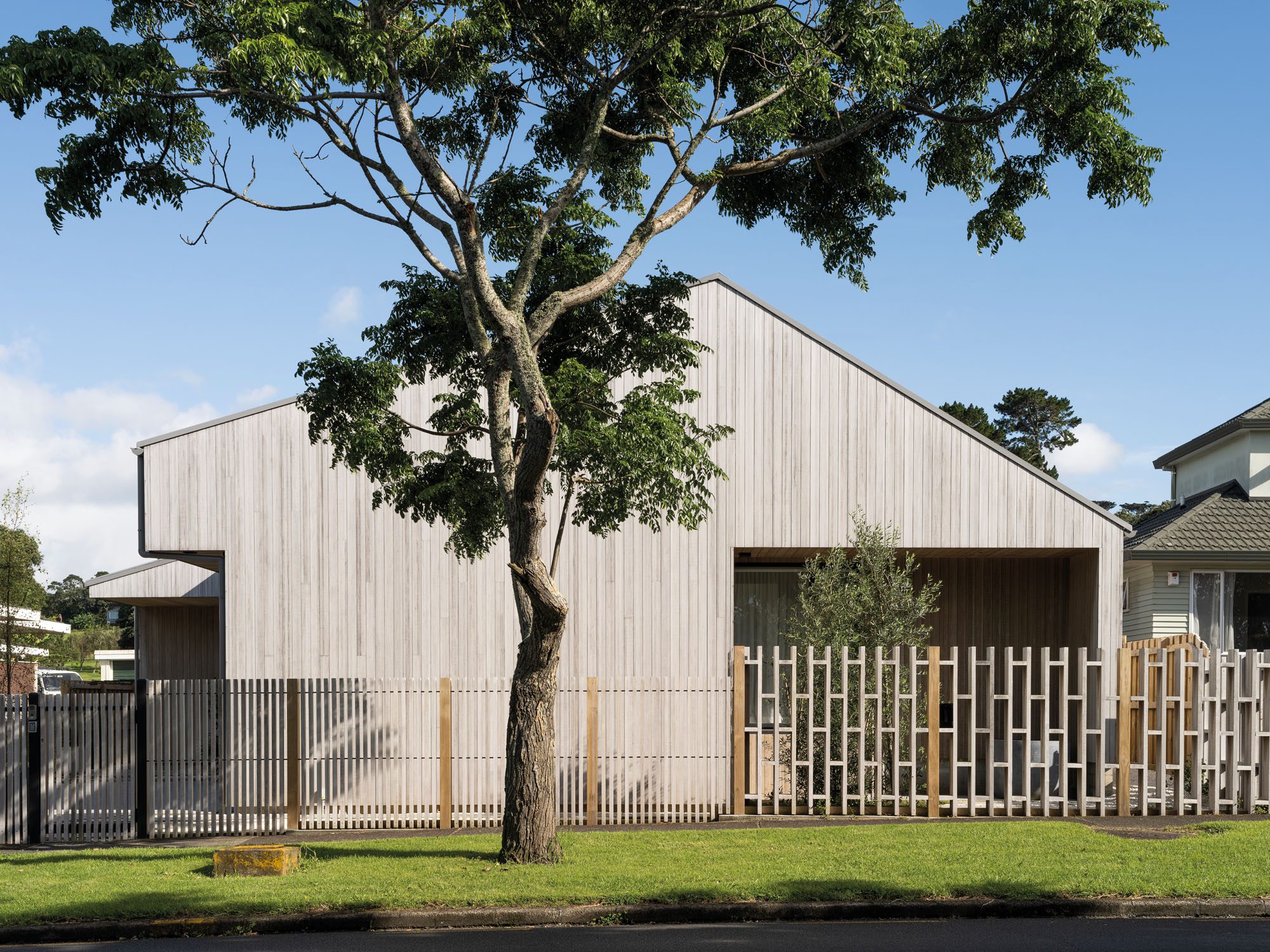 An asymmetrical gabled form to the street is closed to passers-by. Vertical timber cladding is structured and rhythmic against a mature tree on the berm.