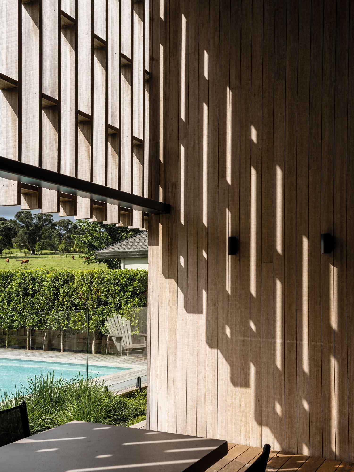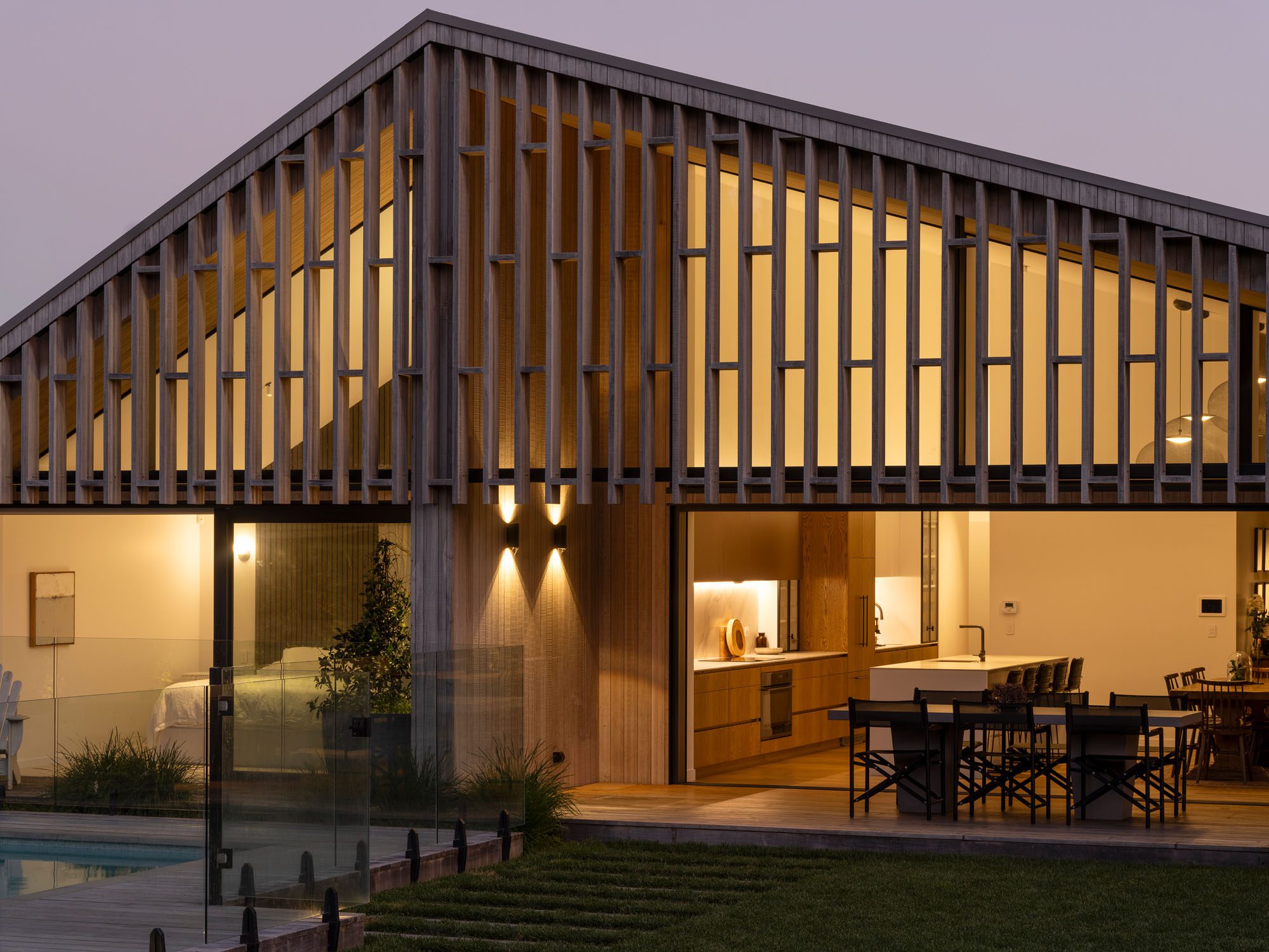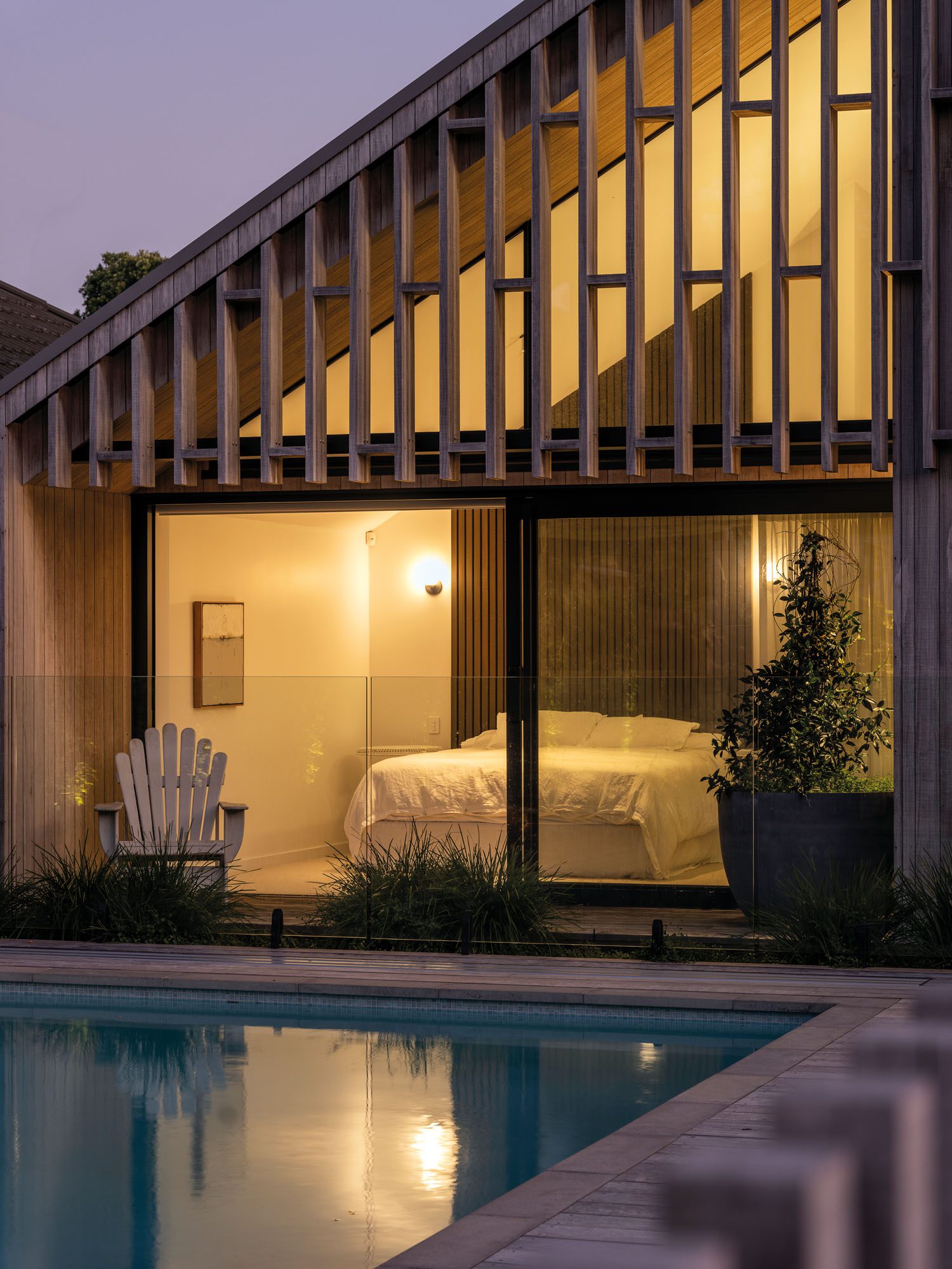 The interior programme is equally as well considered, transitioning from city to park within moments of stepping inside. A hall continues the vertical timber language of the exterior, guiding visitors towards the combined kitchen, dining and living spaces where the rural aspect comes into its own, framed like an artwork. Ceilings reach up to five metres, articulating a sense of space that belies the footprint. A deep deck steps into the landscape, sheltered by an intricate timber screen — its abstract pattern inspired by the park’s post-and-wire fences — casting shifting shards of dappled light inside.