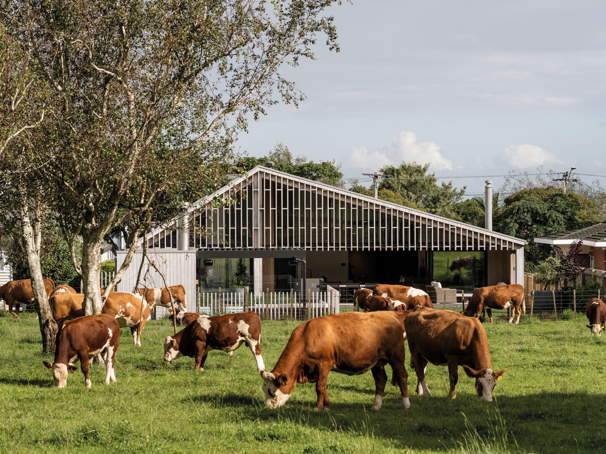 A home for a family of five on the edge of a park. A bucolic landscape, a busy city road, and a house the intermediary; a unified buffer between. A vertical timber-wrapped face, private to the street and open to the pasture.