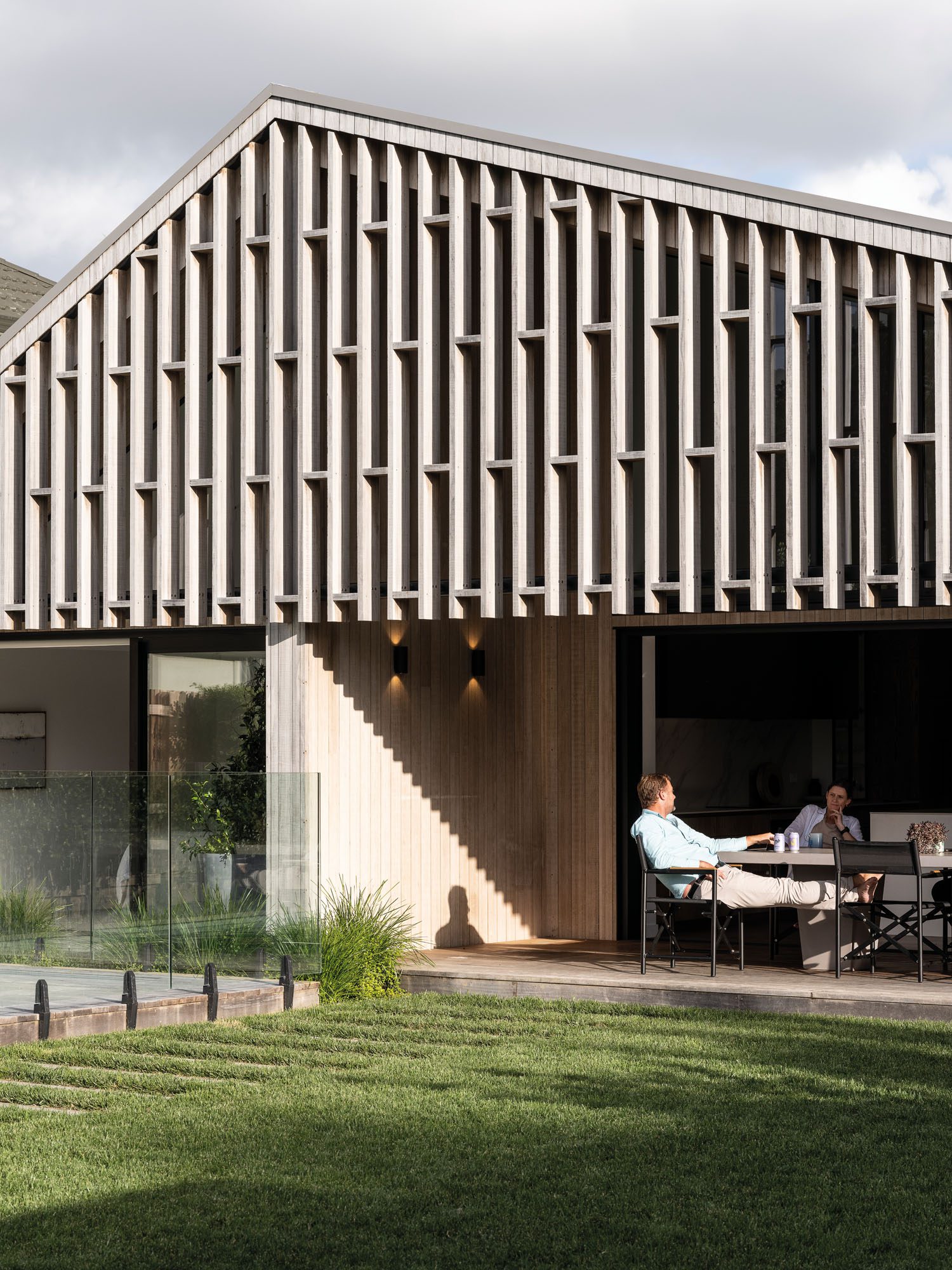 An intricately detailed timber screen shelters the deck and defines the park-facing elevation.