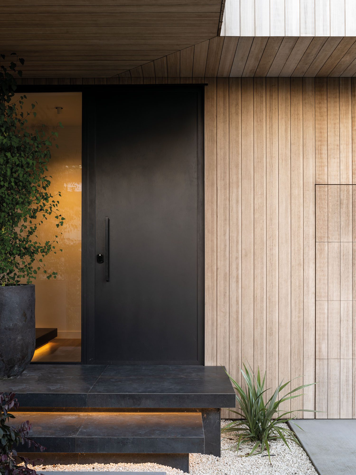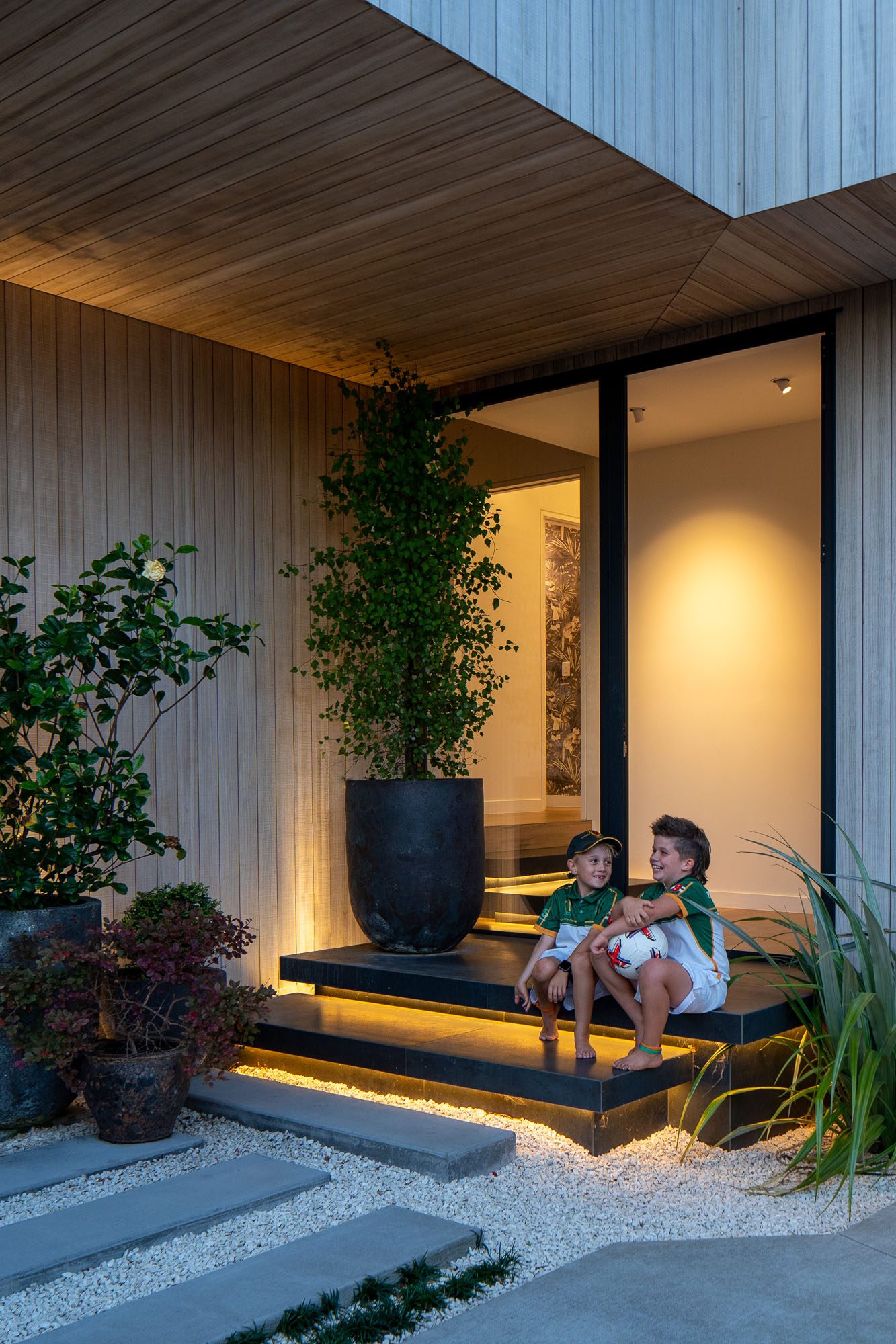 A mature tree on the berm seems to bring this closed façade alive, its intertwining boughs reaching skywards against the pristine verticality of the timber cladding. There’s a theatricality in nature’s hand set against the discipline of this elevation.