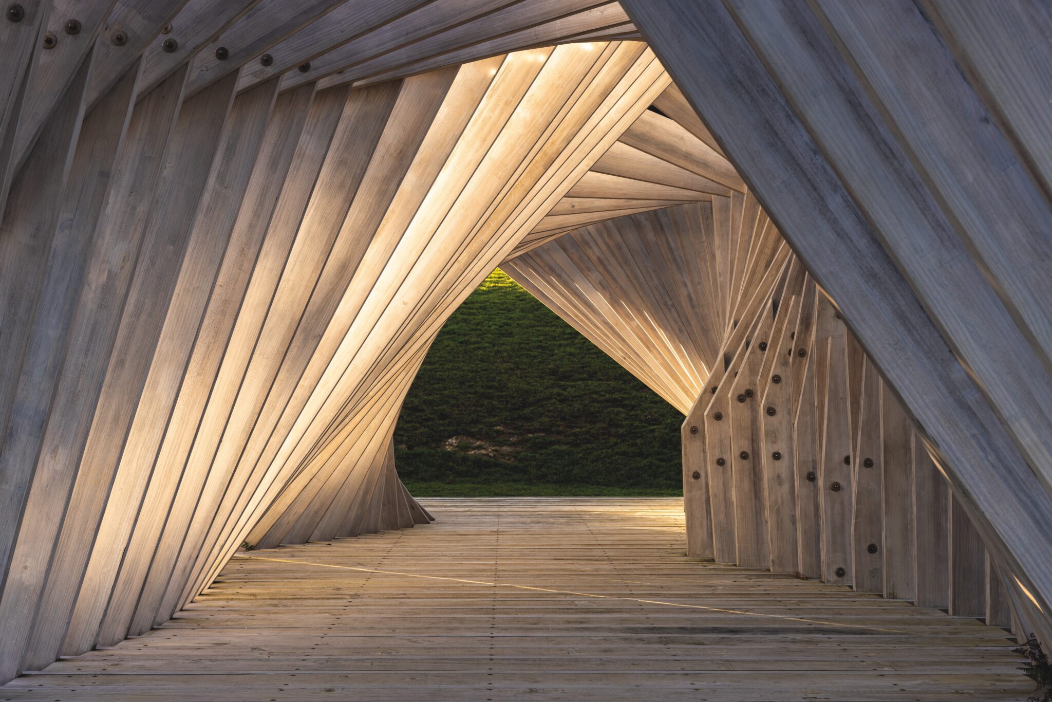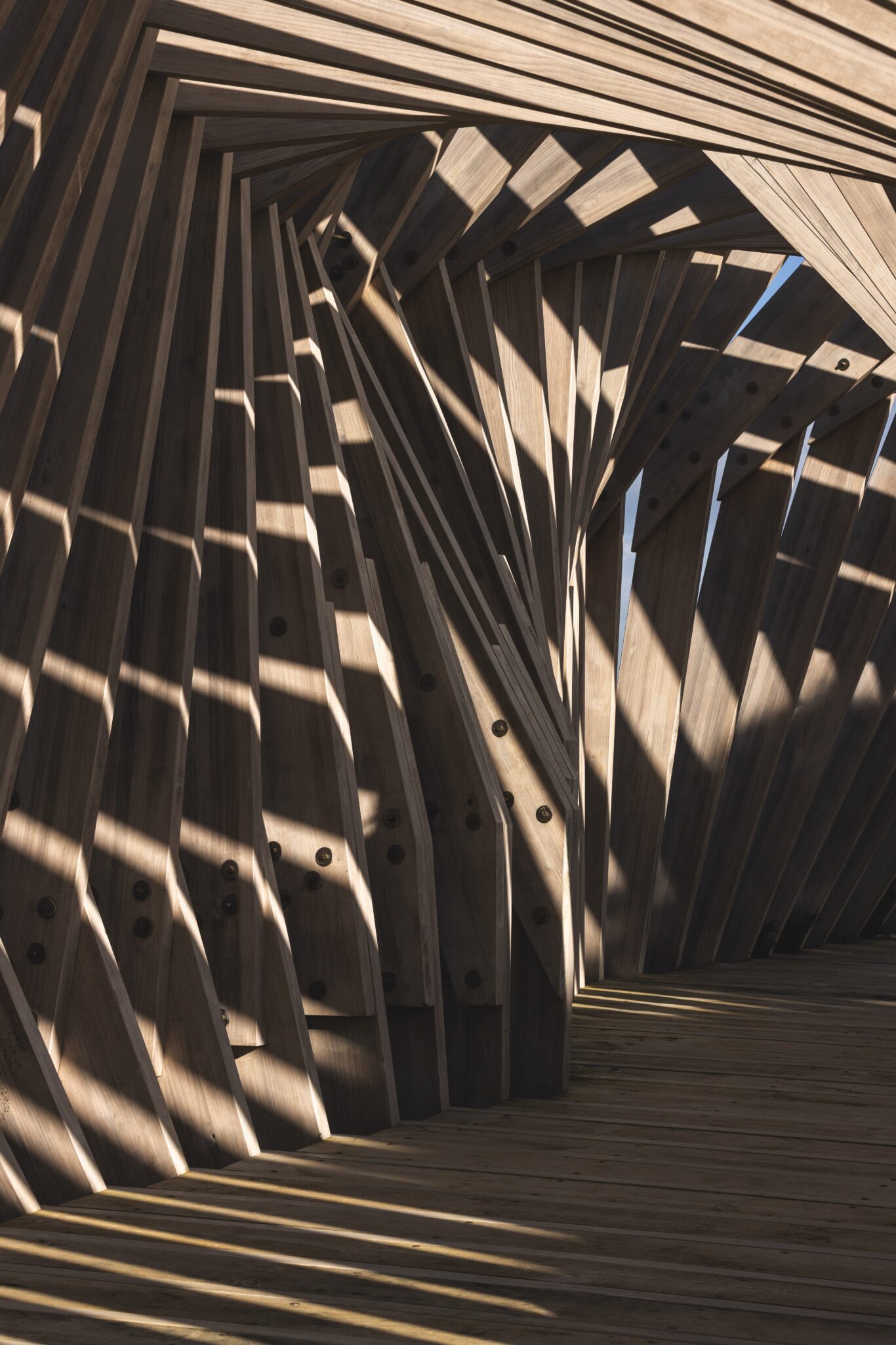 The skeletal structure of the Gateway Pavilion, an architectural folly designed by Stevens Lawson, focuses its many viewers’ gazes steadfastly on the water. The dynamic 16-metre journey through its moving form evokes a whare, a meeting house, a barn, a boat shed — it could be many things; the ideas it presents are vast, morphing as you move through it, but it’s an experience that is distinctly unified: an amalgamation of ideas that form an abstract narrative of Aotearoa’s architectural history.