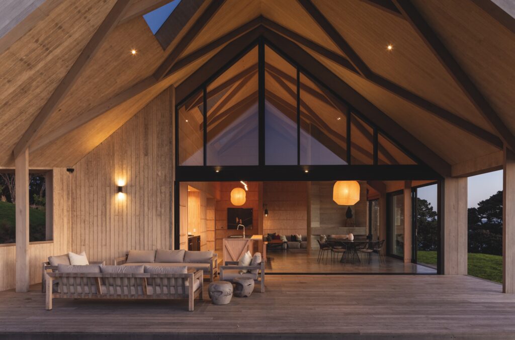 Pivoting around natural curves in the land, it too references whare, and the quintessential New Zealand barn. By separating the pavilions — two for sleeping, one for living — private, sheltered courtyards, micro gardens, are formed in the voids between.