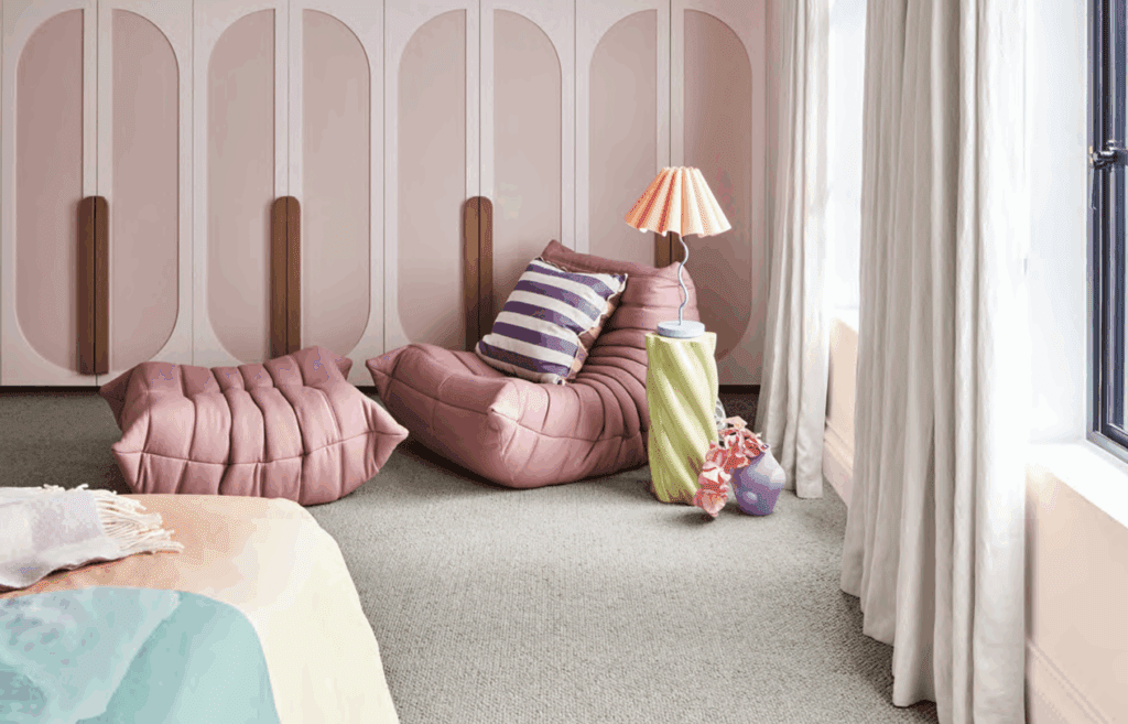 There is also a softer side to abundance, one expressed in the bedroom above through gentle colour and whimsical form. In this space, Feltex’s Stonefields wool carpet in 912 Gypsum underpins a palette of gentle pink, lavender, and soft green. Blush-pink lounge chairs with quilted upholstery form a cosy corner. A twisted green side table and a peach pleated lamp add sculptural punctuation. In this version of maximalism, the carpet is a subtle, textural counterpoint that stabilises a composition otherwise saturated with playful whimsy.