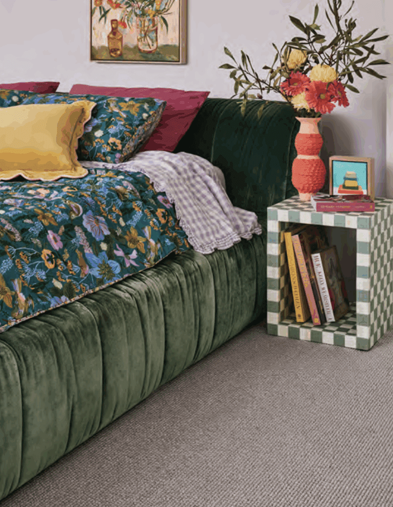 Maximalism can be used for any space, and the bedroom pictured above is a great example. Here, it takes a more playful and exuberant turn. Feltex wool carpet Chelsea Row in the colour 720 Westbourne provides a soft, neutral base for an explosion of colour and pattern layered above. The floor tempers the cacophony of colour and texture, its subtle texture and warmth allowing the room to remain inviting rather than overwhelming. It is maximalism at its most eclectic — embracing playful abandon while remaining immersive and comforting.