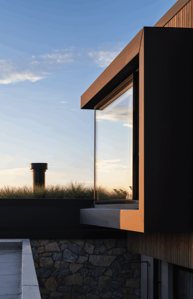 A green roof, punctuated by two ocular skylights, sets the tone for this entertaining space — where the kitchen, living, and dining areas open onto an expansive deck cantilevered over the site’s sloping edge, creating the sense of being perched above the sea.