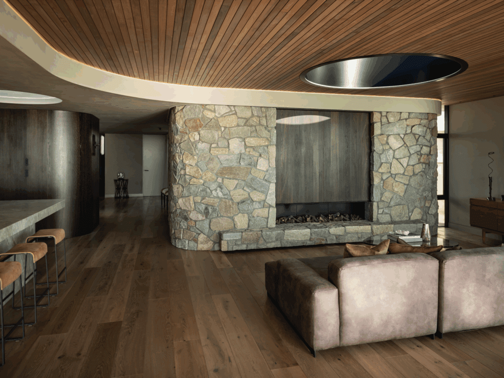 Materials were chosen to reflect the elemental setting of the coast and the maunga beyond. Stone and timber dominate — tactile and engaging, they create a dialogue around the beauty of nature’s imperfection. The verticality of the exterior timber is set against the circular motifs of the skylights; inside, that curvature continues through softly contoured walls, a sculpted kitchen island, and sweeping curves in the ceiling — forming a dynamic series of spaces that feel both fluid and grounded.
